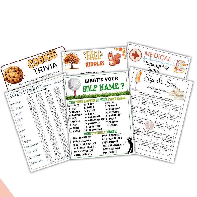 We have printables for every occasion - sports fundraisers, baby shower games, birthday party games, classroom fun, savings trackers and more!