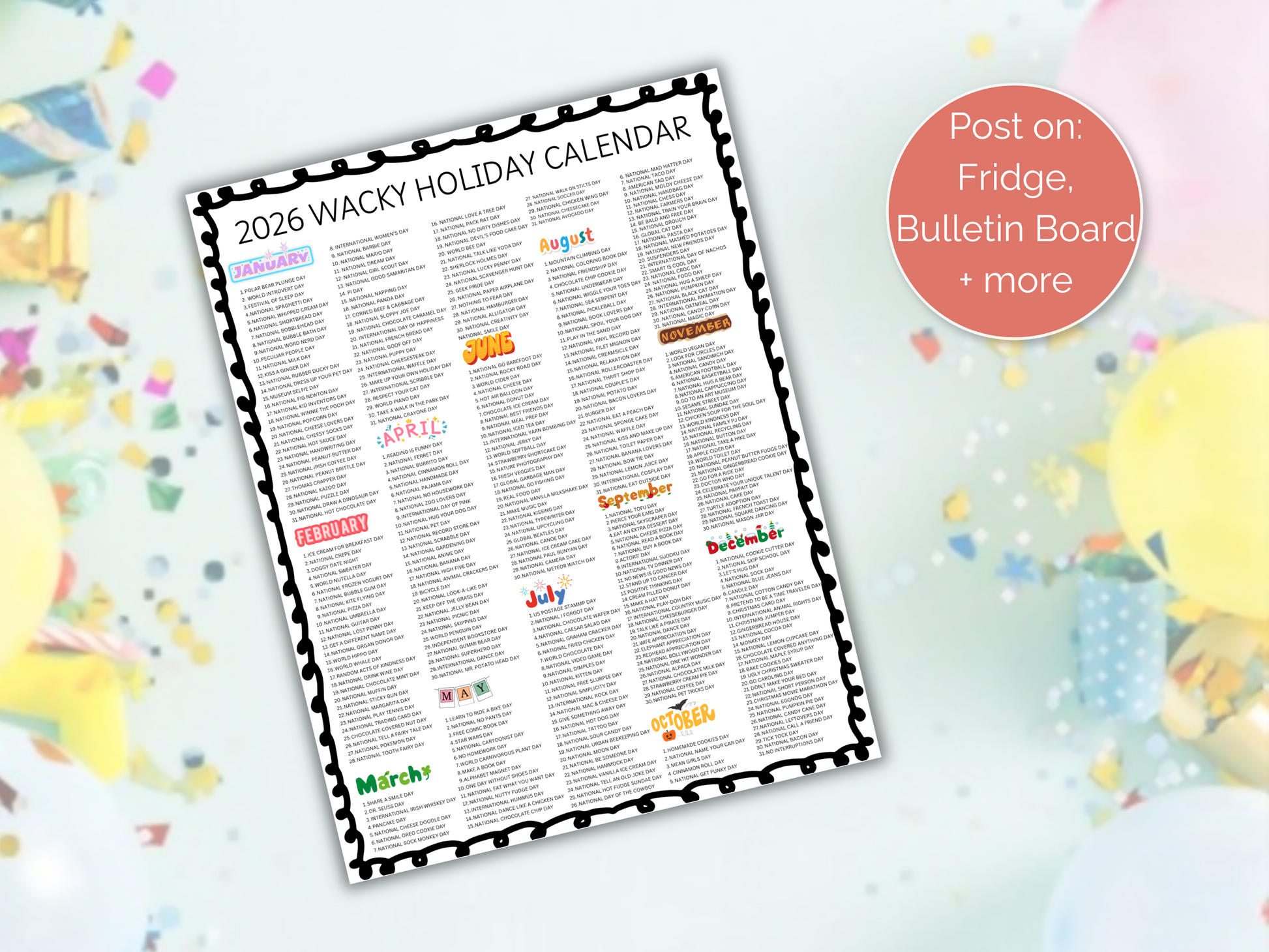 This easy to use 2026 List of Wacky Holidays will give you something fun to celebrate on every single one of the 365 days in the year. Print and post on your refrigerator, bulletin board, in the office, in the classroom and more. Use it for office parties, classroom fun, social media content ideas.