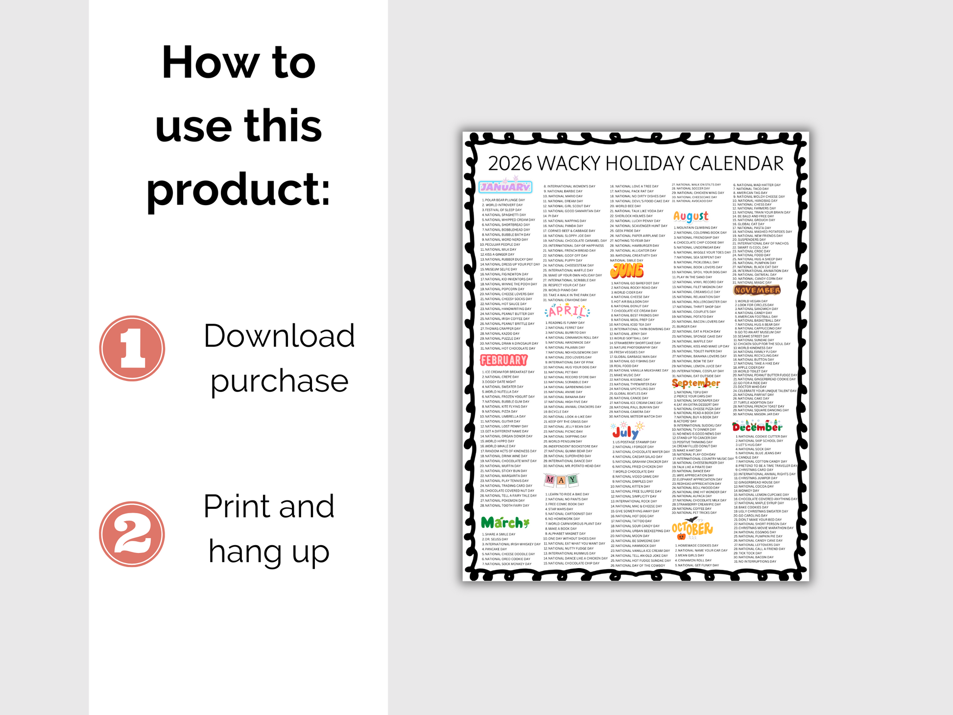 2026 List of Wacky Holidays - Print on 8.5 x 11 size paper