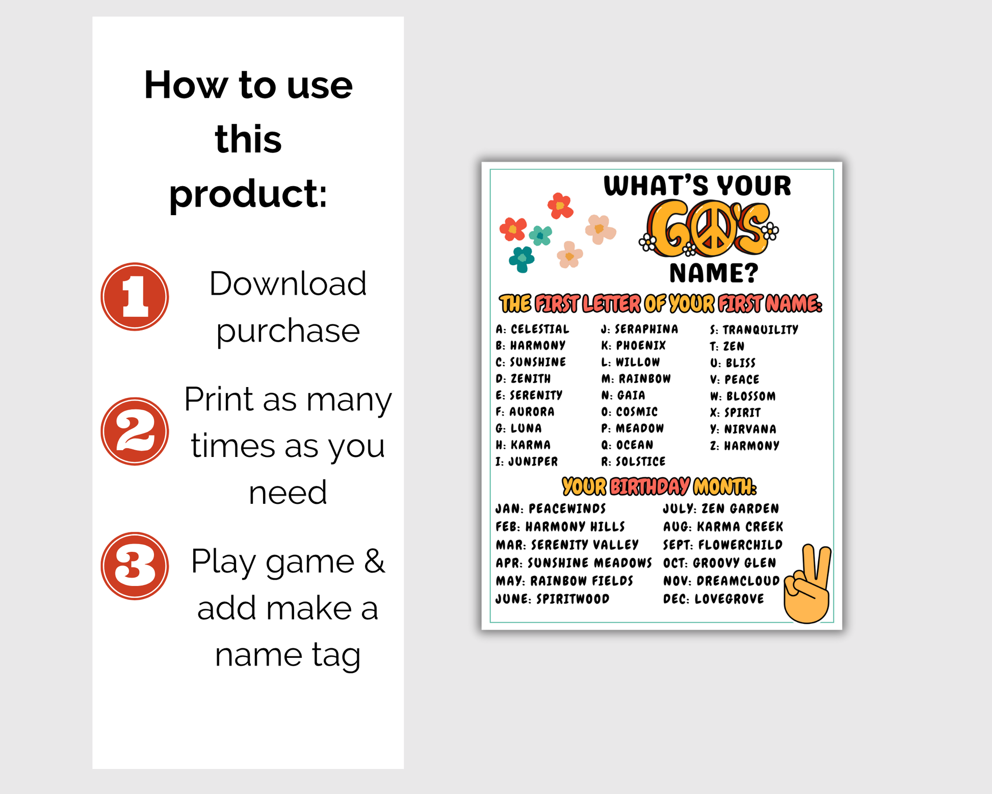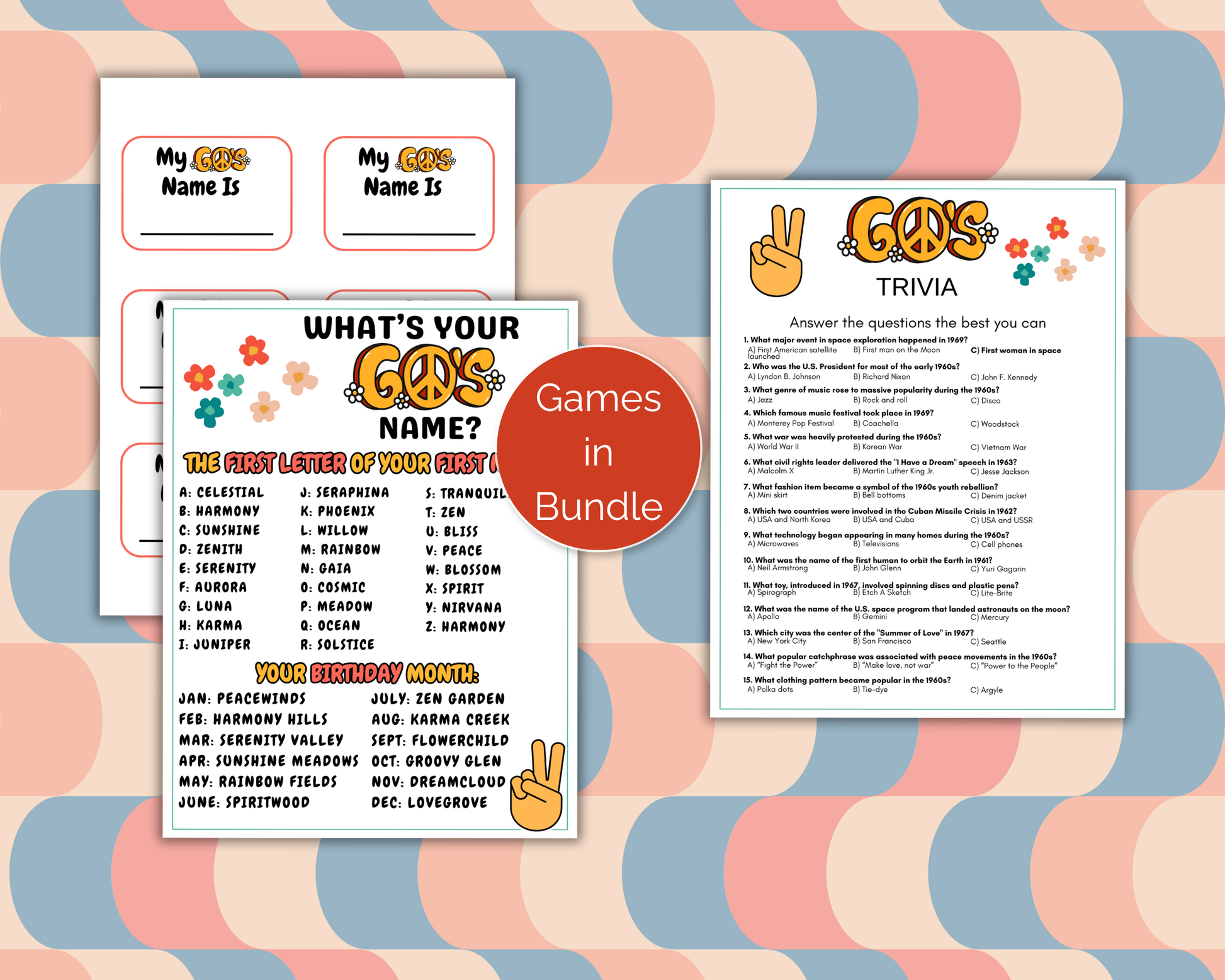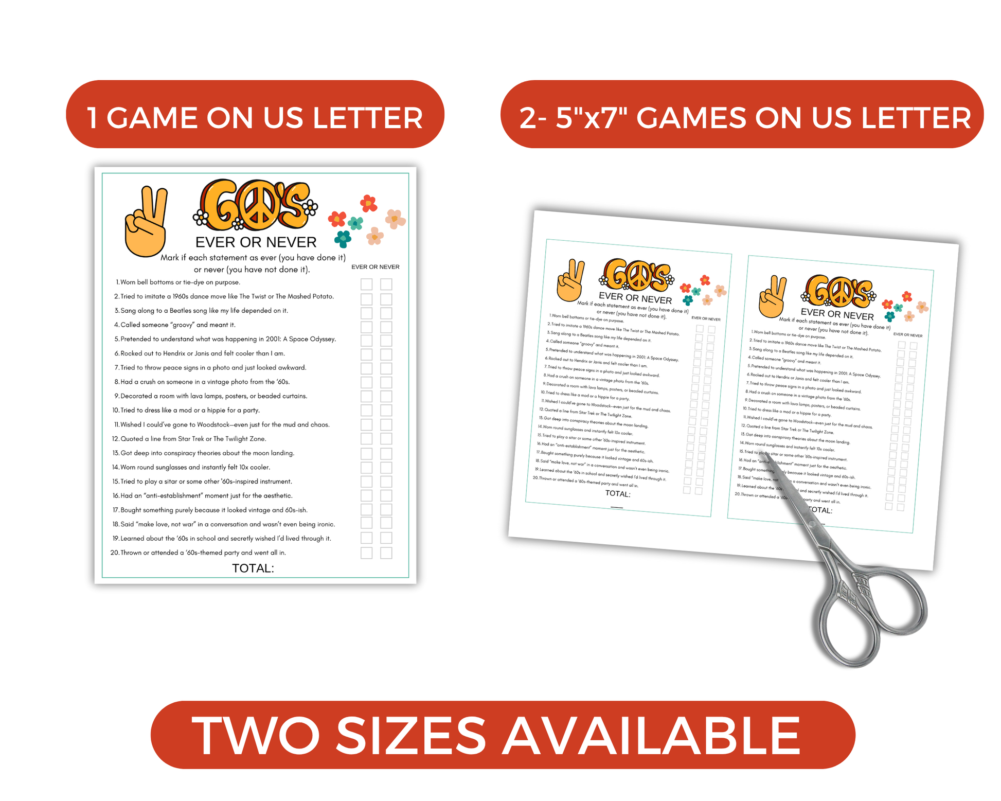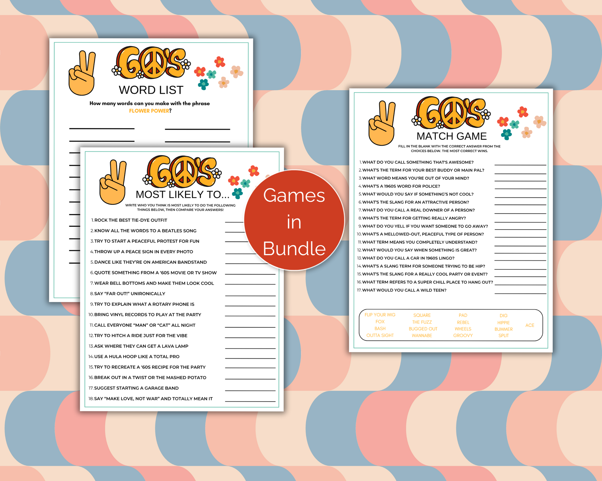 This fun 60s party game bundle is a great 60s themed activity to play at birthday parties, 60s parties, anniversaries and more. It comes with 9 games. Simply print the games as many times as you like and start playing.
