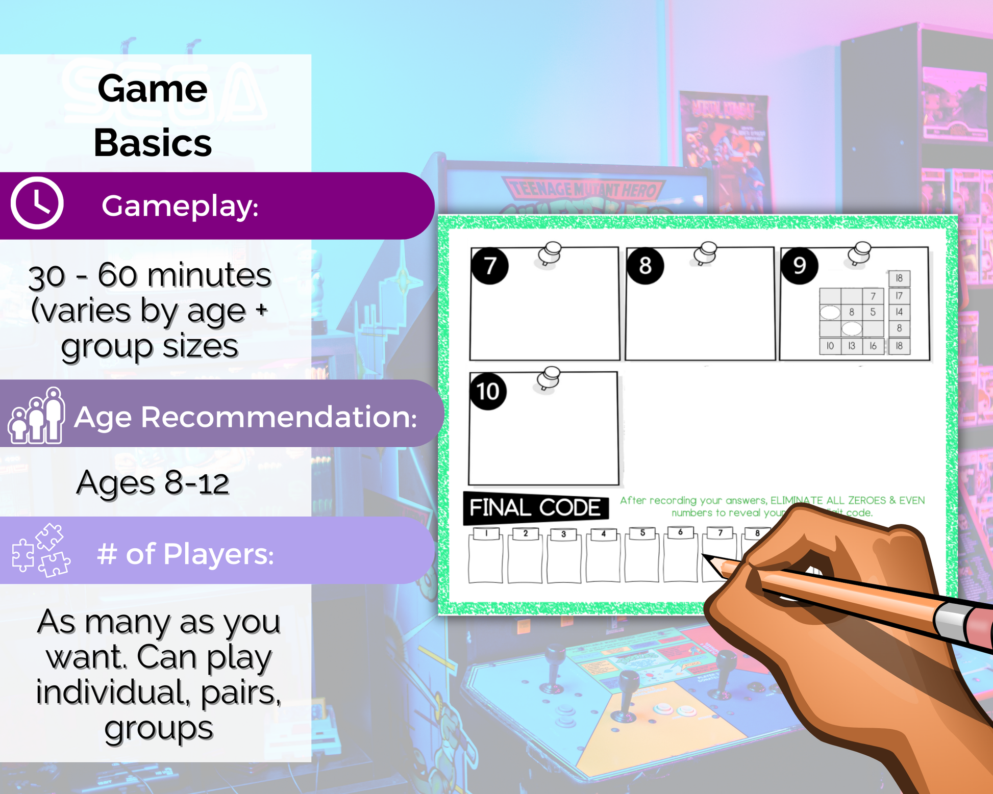 This fun Arcade Escape Room is a great gaming themed activity for kids to play. It comes with 10 puzzle challenges that reveal a secret code to win/escape. This fun escape room game is great for kids aged 8-12 to play at birthdays, sleepovers, celebrations, and more.