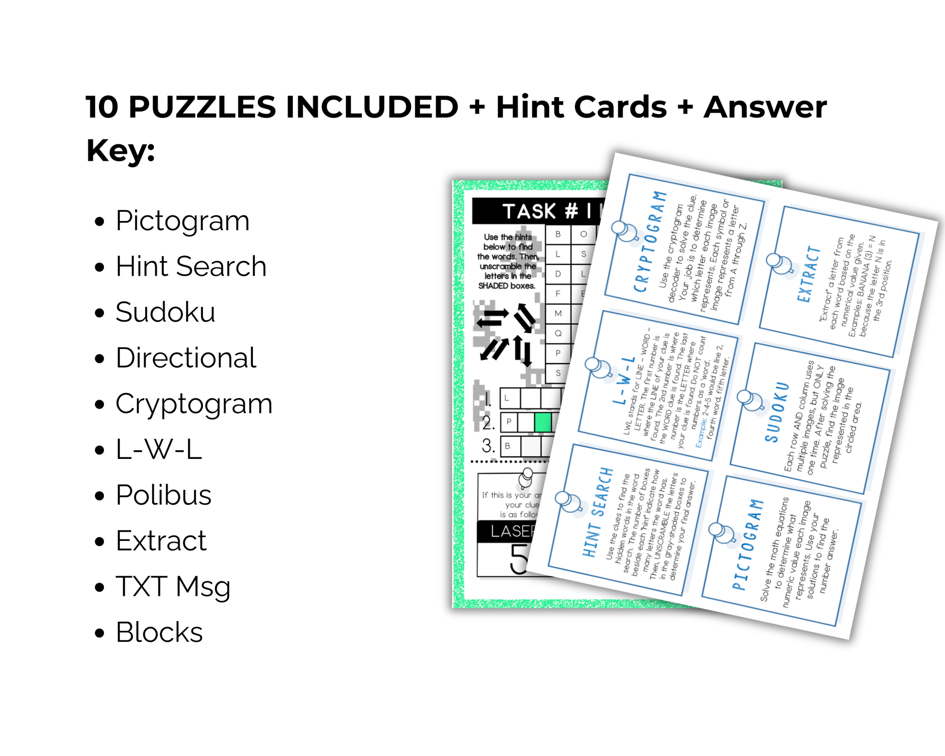 🔎Kids/teams will visit each of the 10 stations/puzzles and use their recording sheet to write the solution down. Hint cards are available for those who need them.