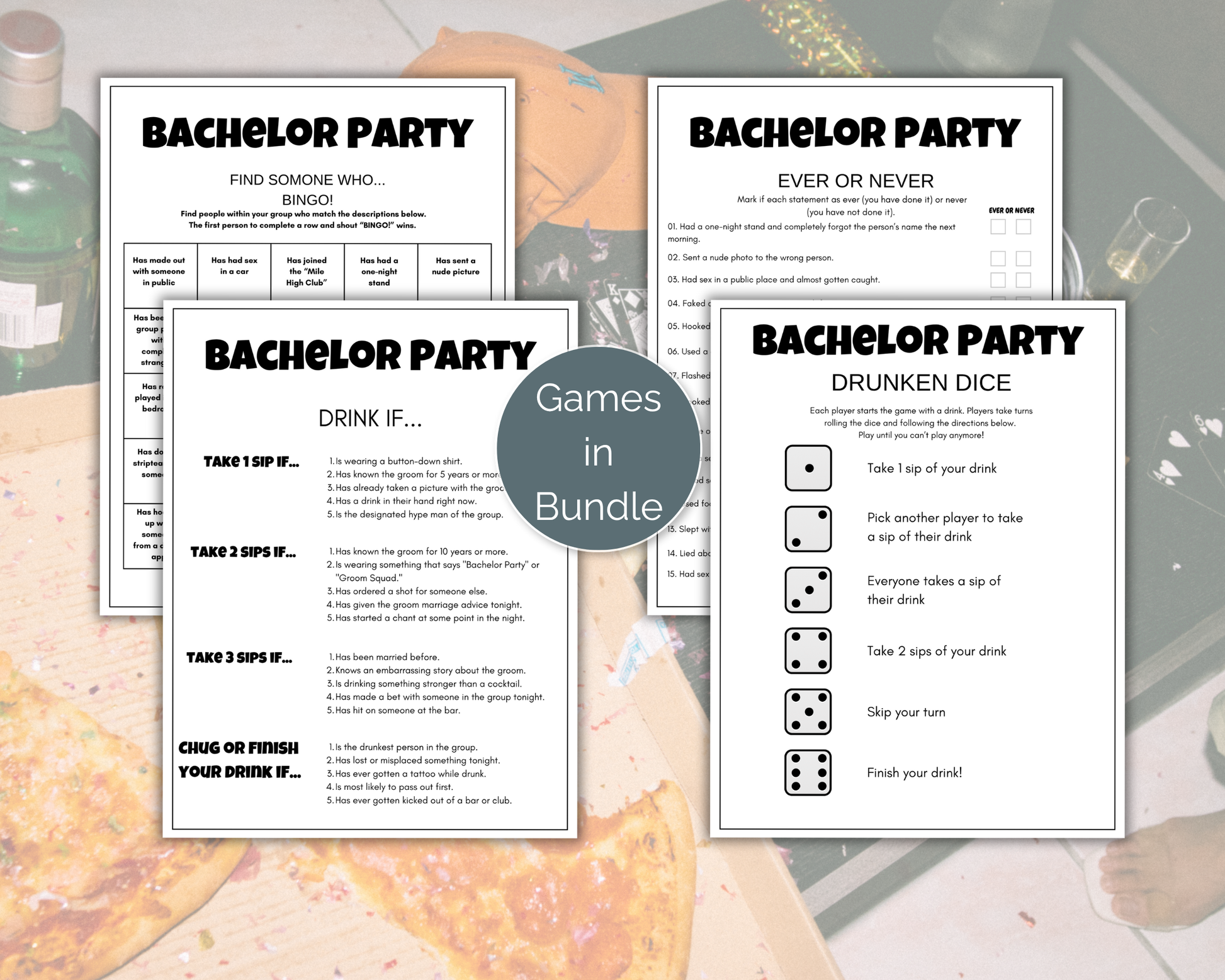 This fun bachelor party game bundle is a great bachelor themed activity to play at stag parties, bachelor parties and more. It comes with 8 games. Simply print the games as many times as you like and start playing.