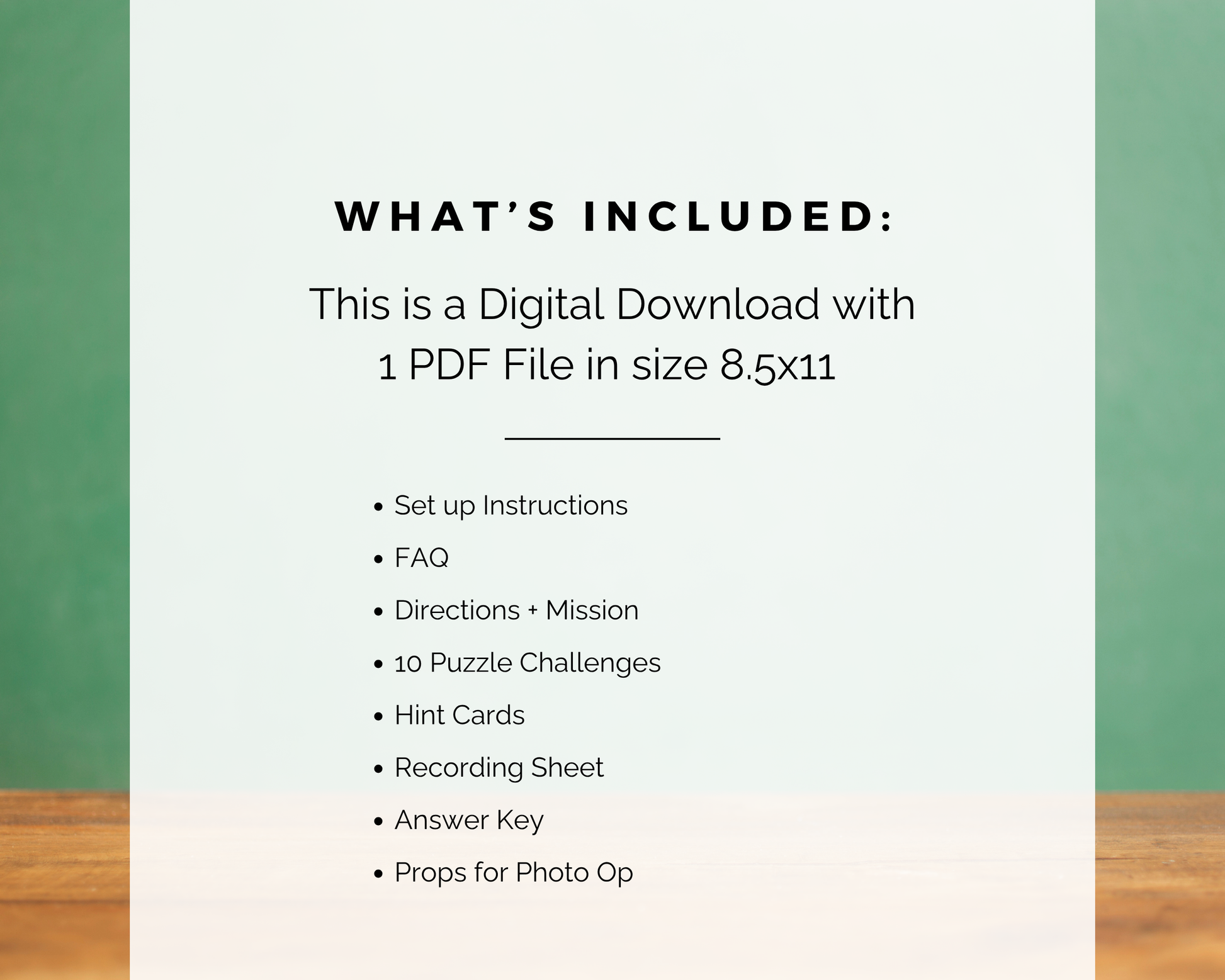 🔎Kids/teams will visit each of the 10 stations/puzzles and use their recording sheet to write the solution down. Hint cards are available for those who need them.