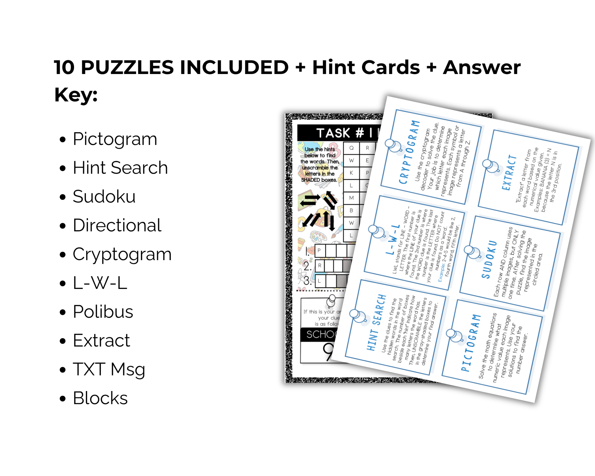 🔎 Set up 10 puzzle solving stations (or just spread the puzzle clues out on a table or the floor).