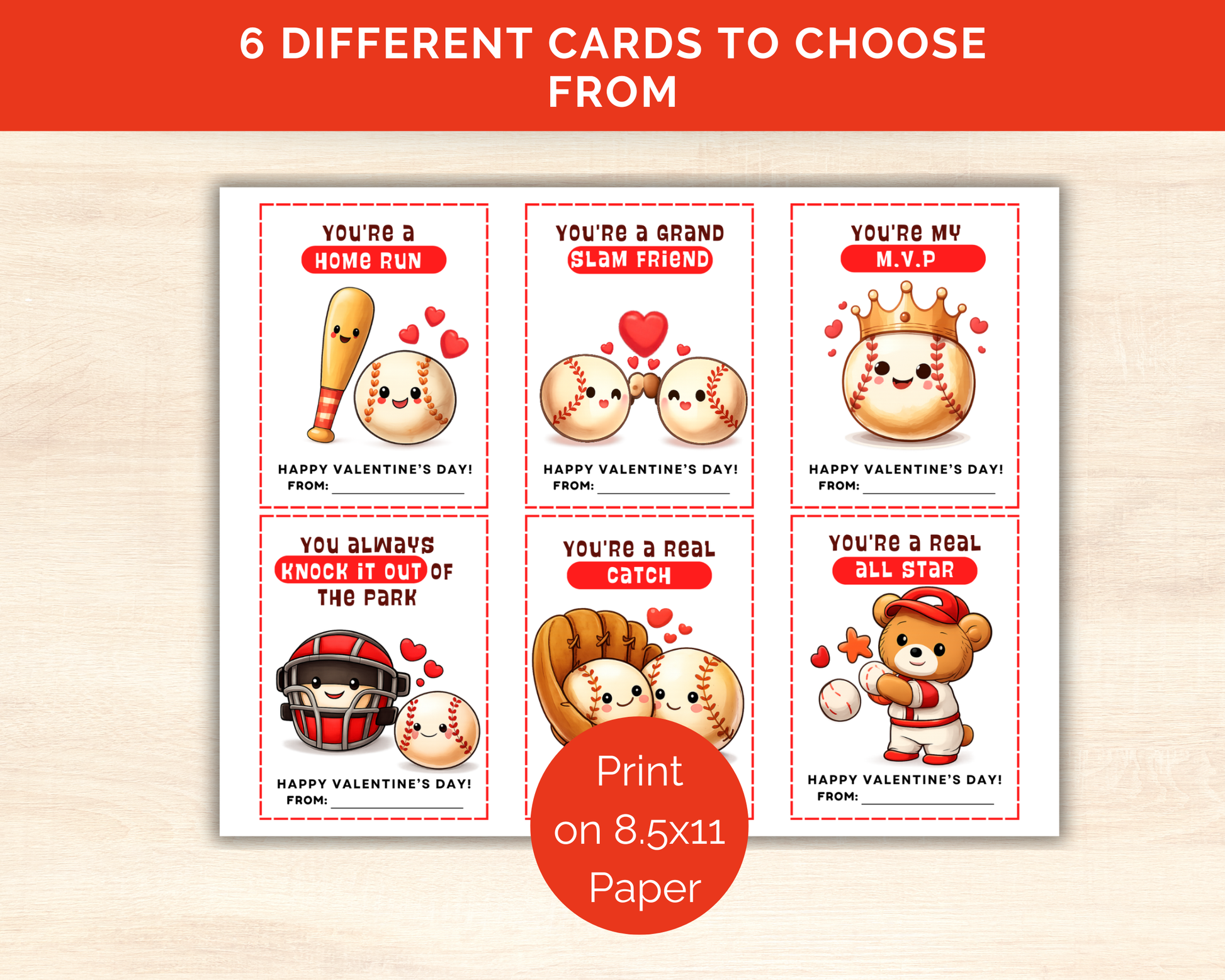 6 Baseball Valentine Cards - 6 per page, sized 3x4 inches each. Print on 8.5 x 11 paper.