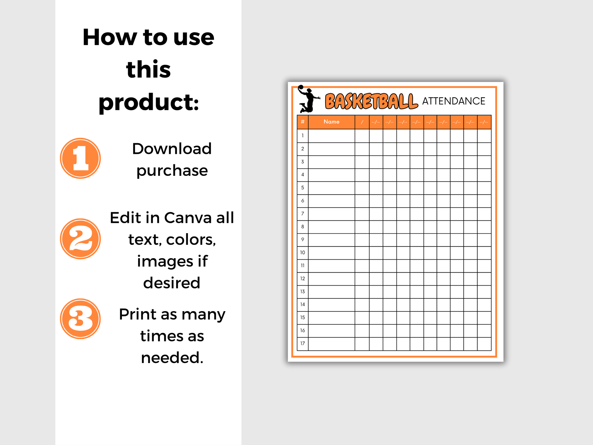 This simple, easy to use Basketball Attendance Sheet is perfect for coaches + assistants to keep track of which players have attended practices on what dates. Simply print, add your players names and check off when they attend practices or games.