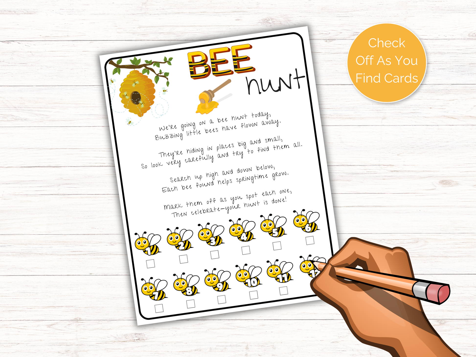 This fun Bee Scavenger Hunt Game is a great bee themed activity for kids to play in the classroom, at home, as a homeschool activity, on bee day and more. Simply print the game, hide the clue cards, read the fun poem and let kids search for the cards checking them off as they find them.