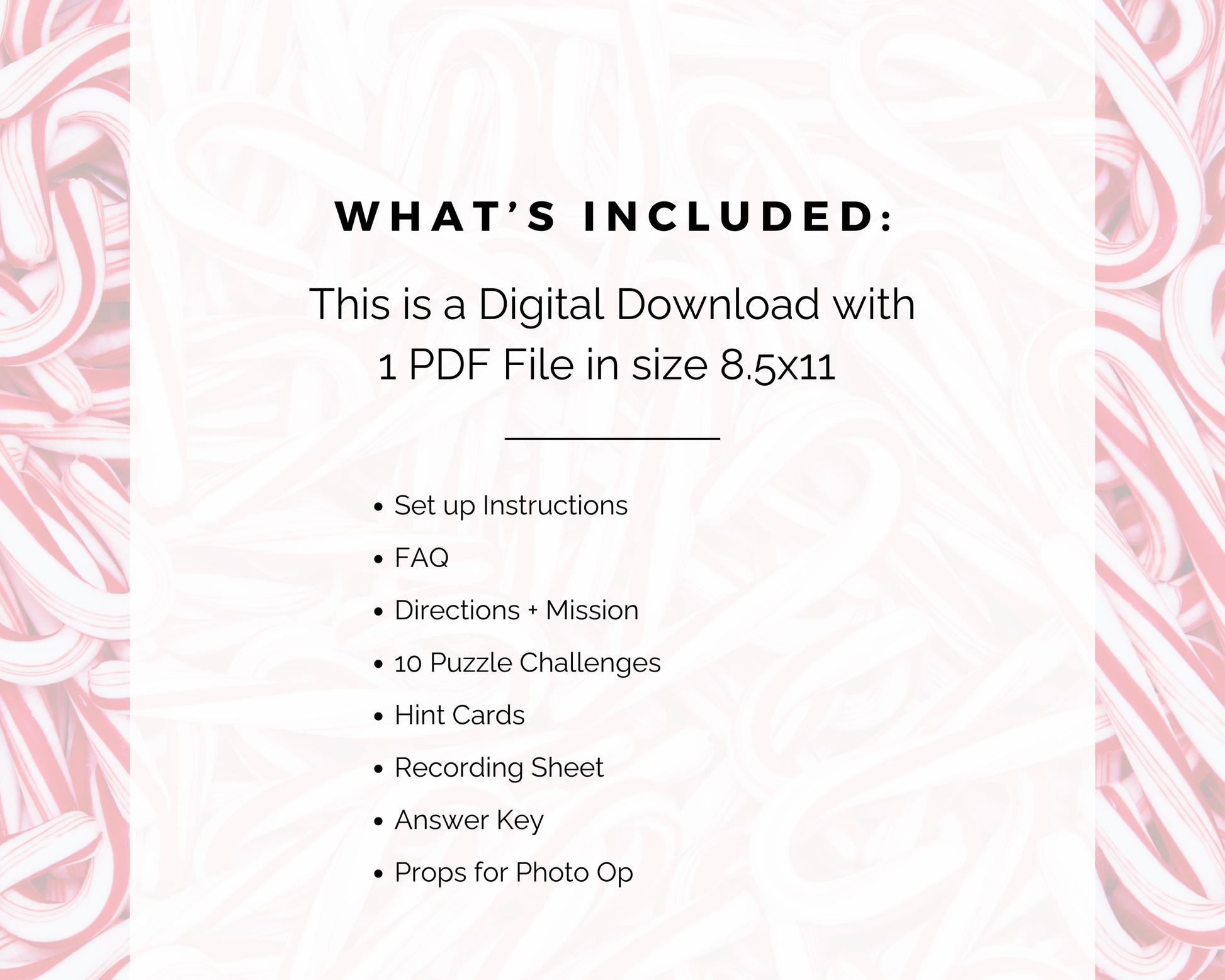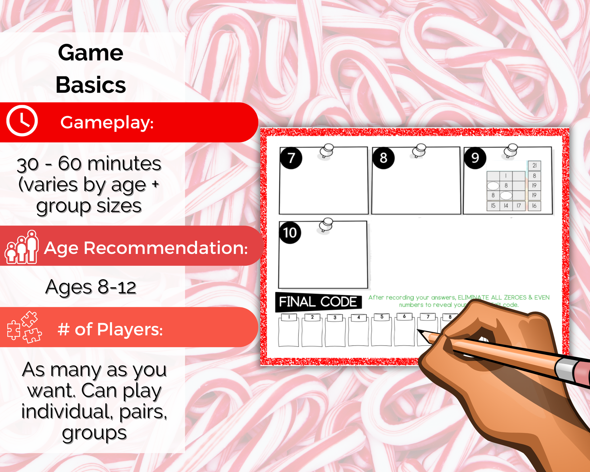 This fun Candy Cane Escape Room is a great candy cane themed activity for kids to play. It comes with 10 puzzle challenges that reveal a secret code to win/escape. This fun escape room game is great for kids aged 8-12 to play at birthdays, sleepovers, holiday celebrations, and more.