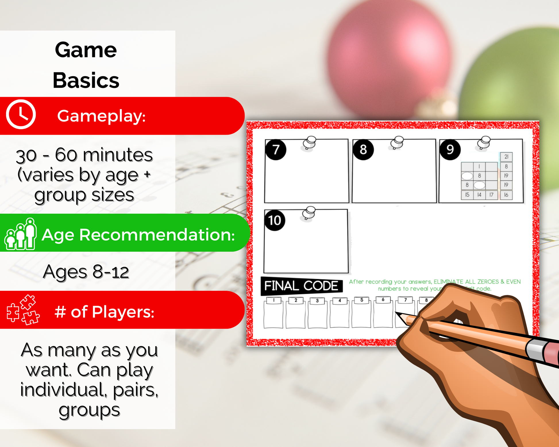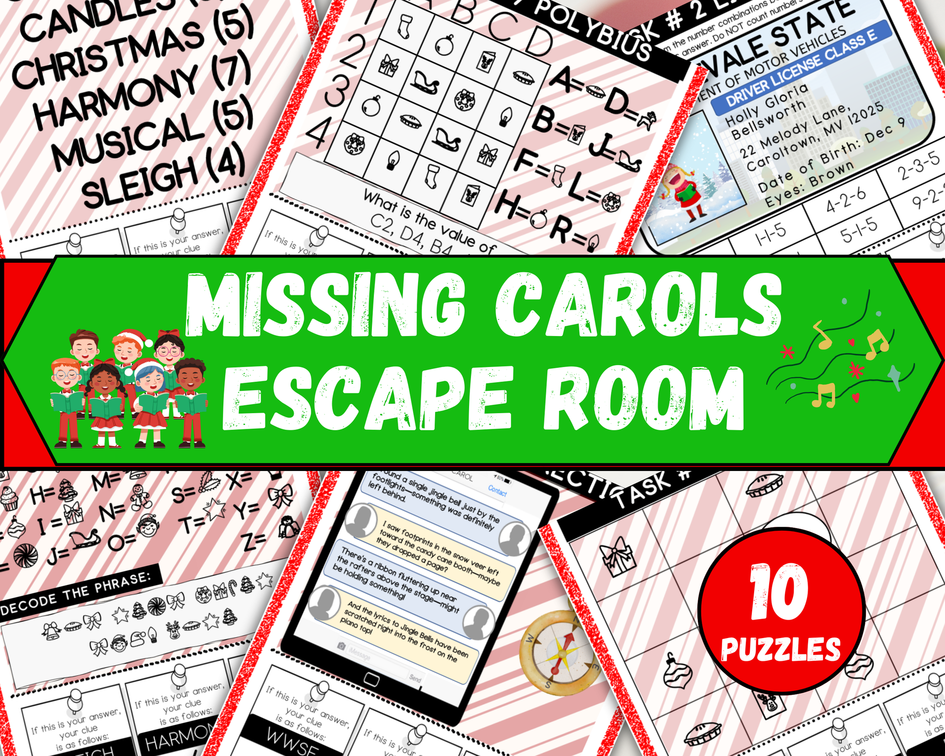 This fun Missing Christmas Carols Escape Room is a great Christmas activity for kids to play. It comes with 10 puzzle challenges that reveal a secret code to win/escape. This fun escape room game is great for kids aged 8-12 to play at christmas parties, birthdays, sleepovers, celebrations, and more.