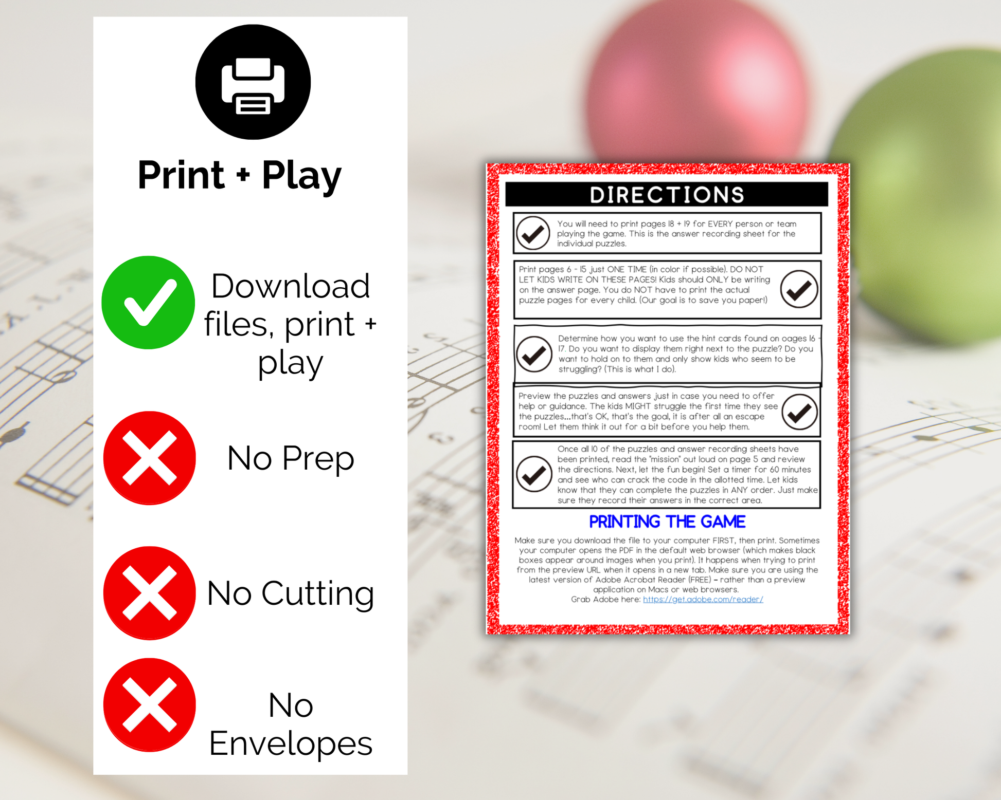 There is NO prep, NO cutting, NO folding, NO envelopes etc needed for our escape room. Simply print the PDF file and start playing.