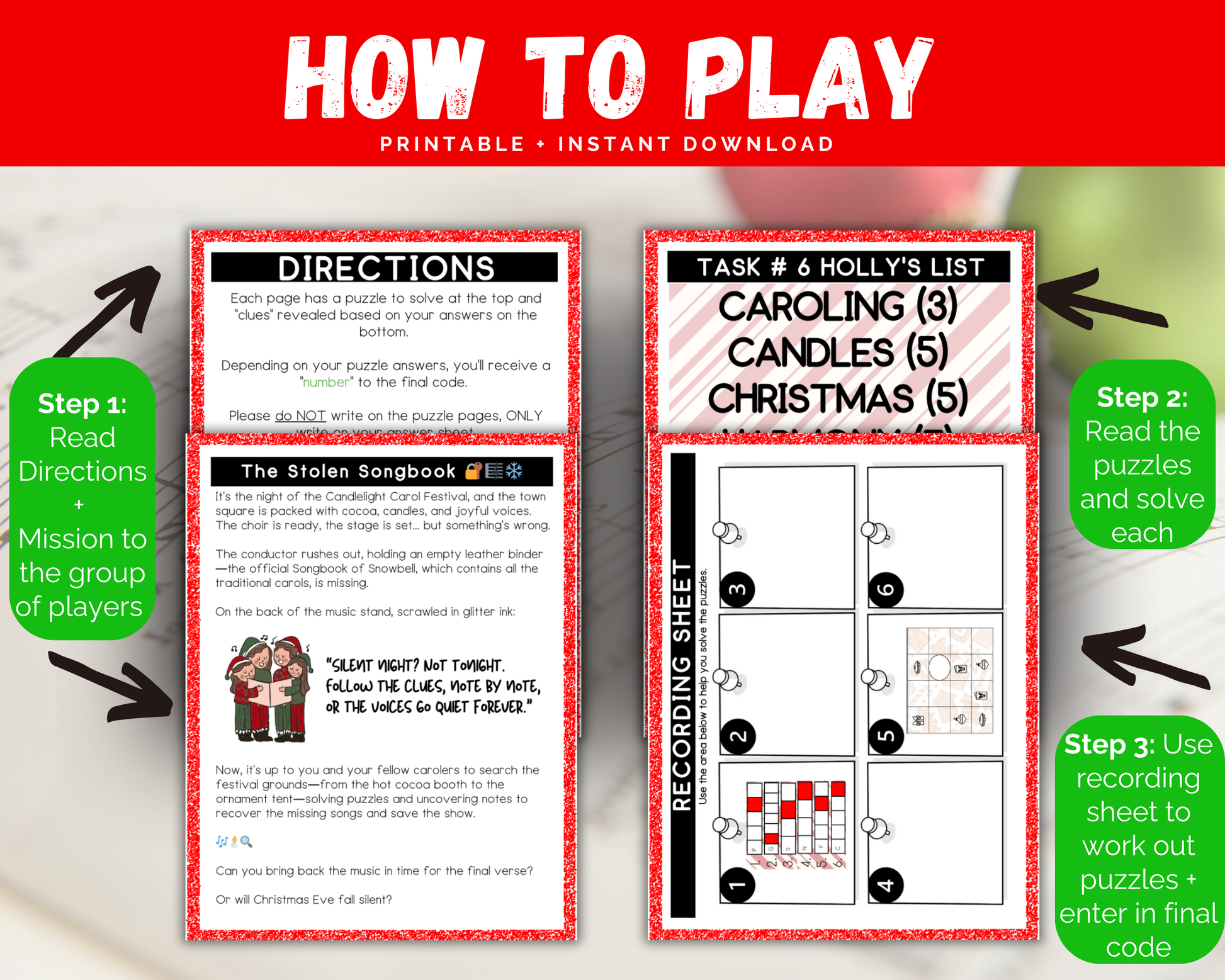 Now, it’s up to you and your fellow carolers to search the festival grounds—from the hot cocoa booth to the ornament tent—solving puzzles and uncovering notes to recover the missing songs and save the show.