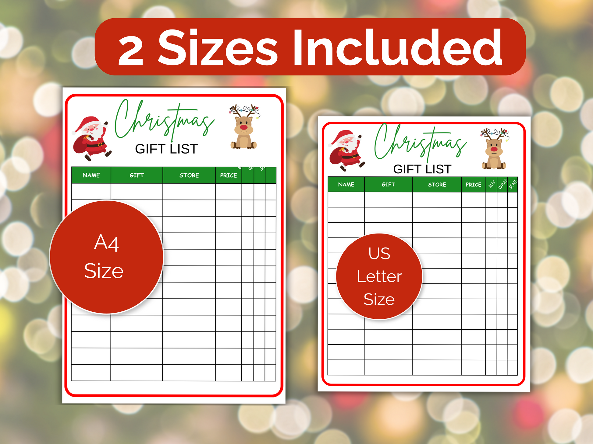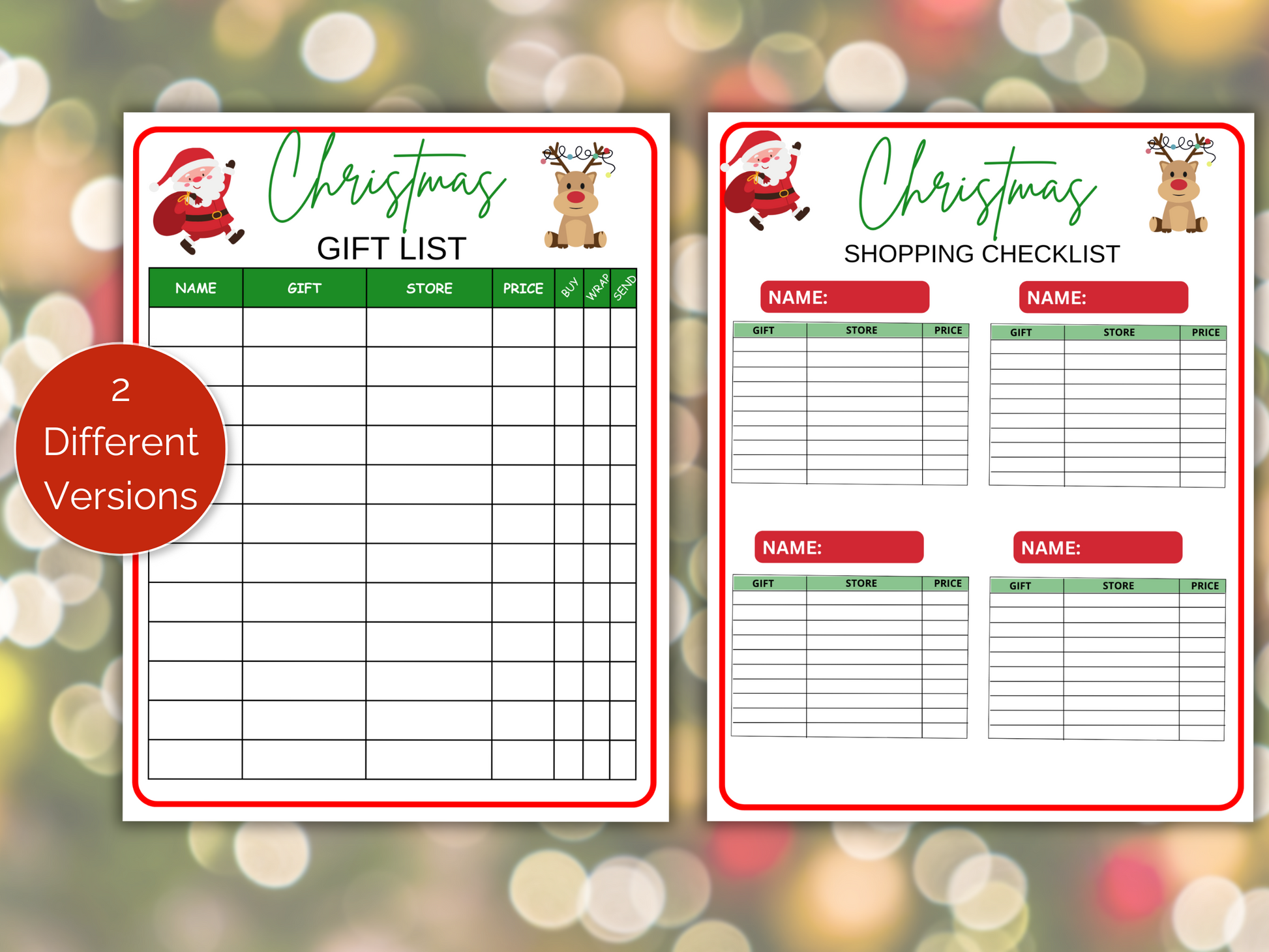 Christmas shopping gift list with 2 different designs - Print on A4 size paper