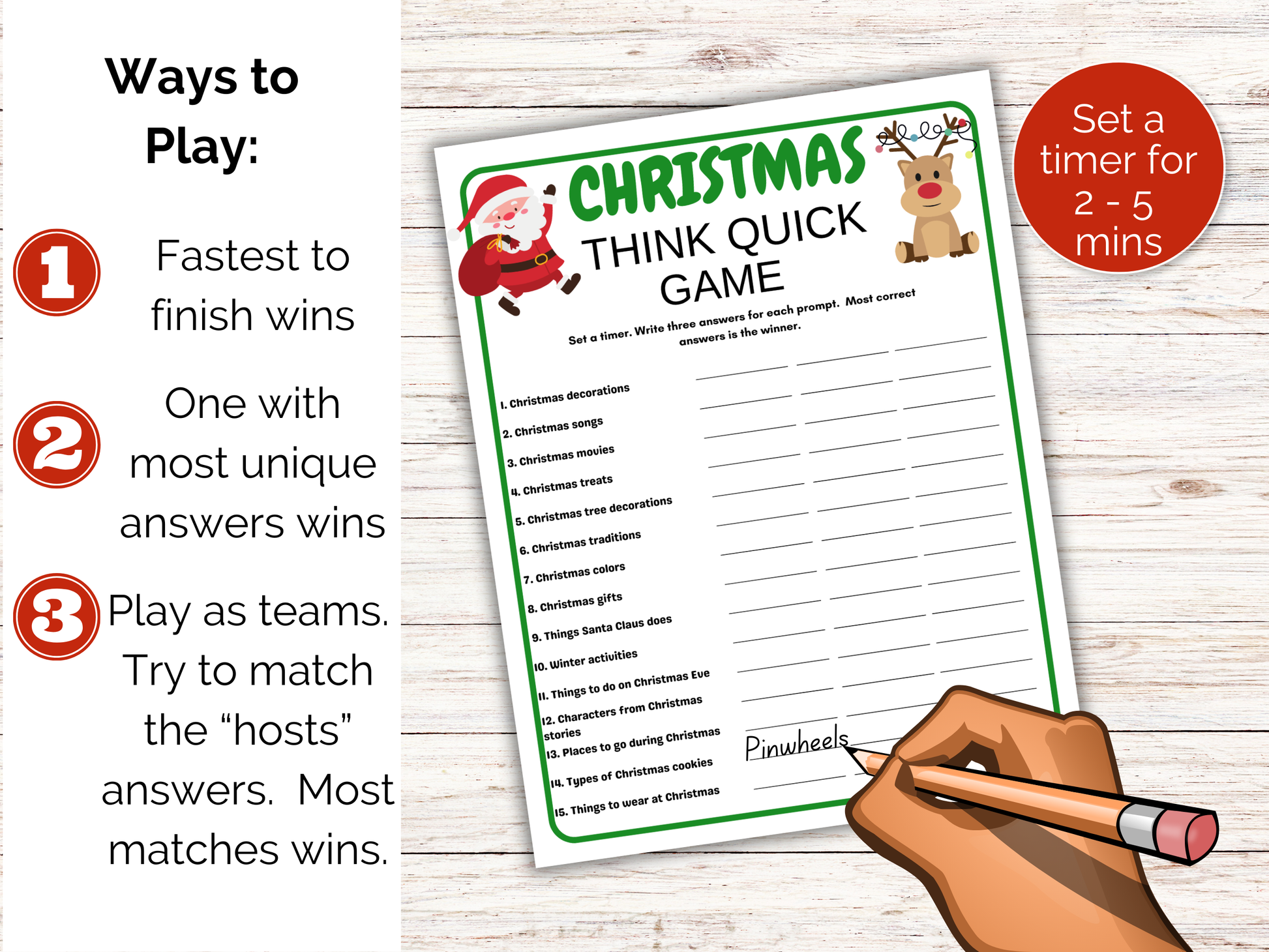 This fun Christmas Think Quick Game is a great Christmas themed activity for kids, teens and adults to play at birthdays, holiday parties, office parties, family game night and more. Simply print the game, set a timer and write your answers.