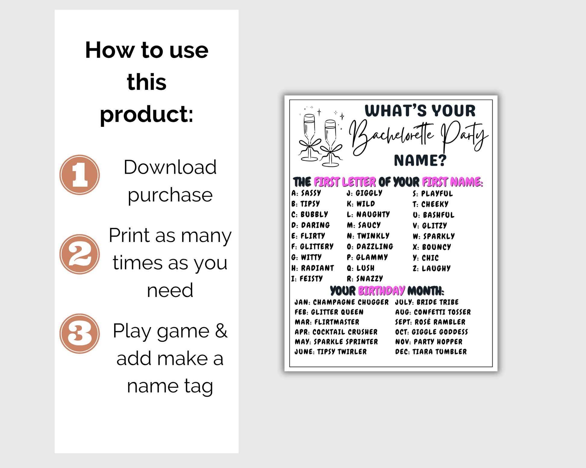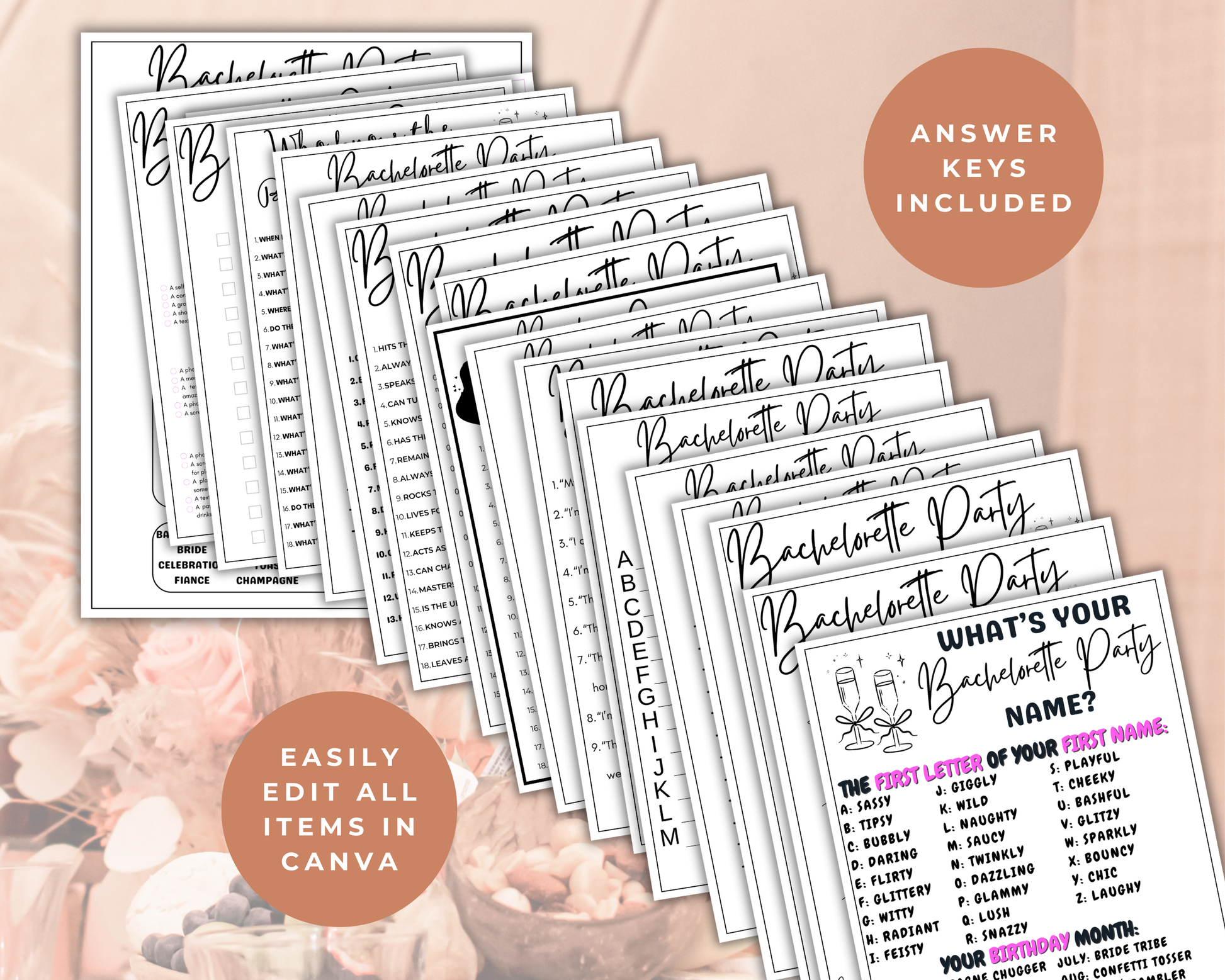 This fun Dirty Bachelorette game bundle is a great bachelorette themed activity to play at bachelorette parties, hen parties and more. It comes with 19 games. You can print and play or edit the games. You can edit all text, colors, images and more in canva to customize these for your party.