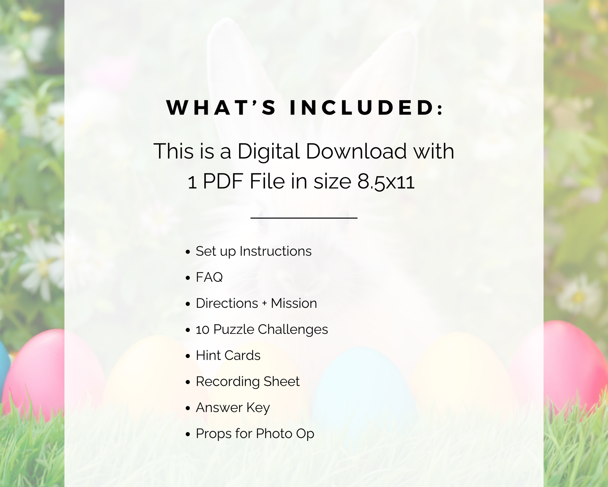 This fun Easter Bunny Escape Room is a great easter bunny themed gme for kids to play. It comes with 10 puzzle challenges that reveal a secret code to win/escape. This fun escape room game is great for kids aged 8-12 to play at easter parties, easter egg hunts, on easter Sunday, in the classroom and more.
