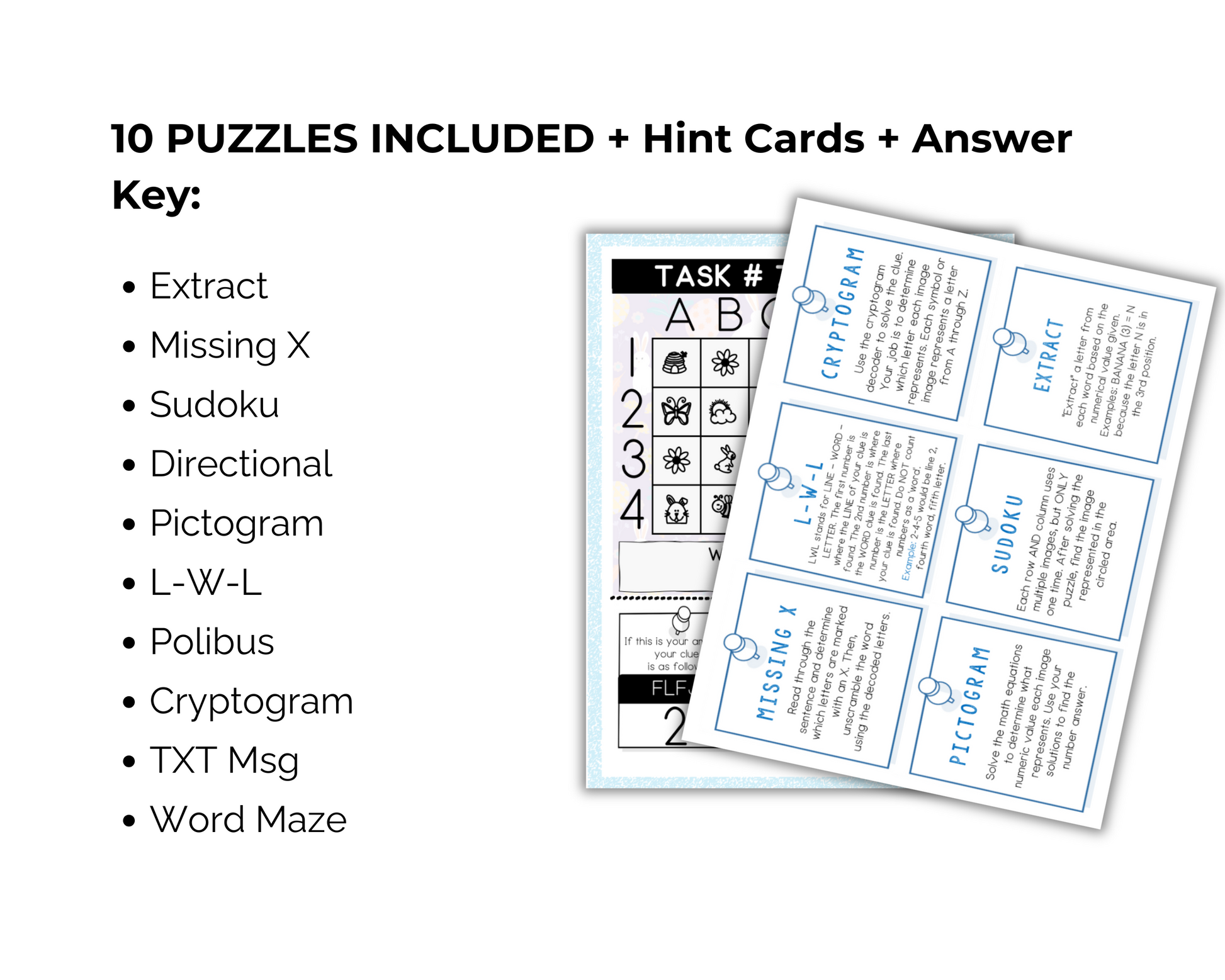 🔎 Set up 10 puzzle solving stations (or just spread the puzzle clues out on a table or the floor).