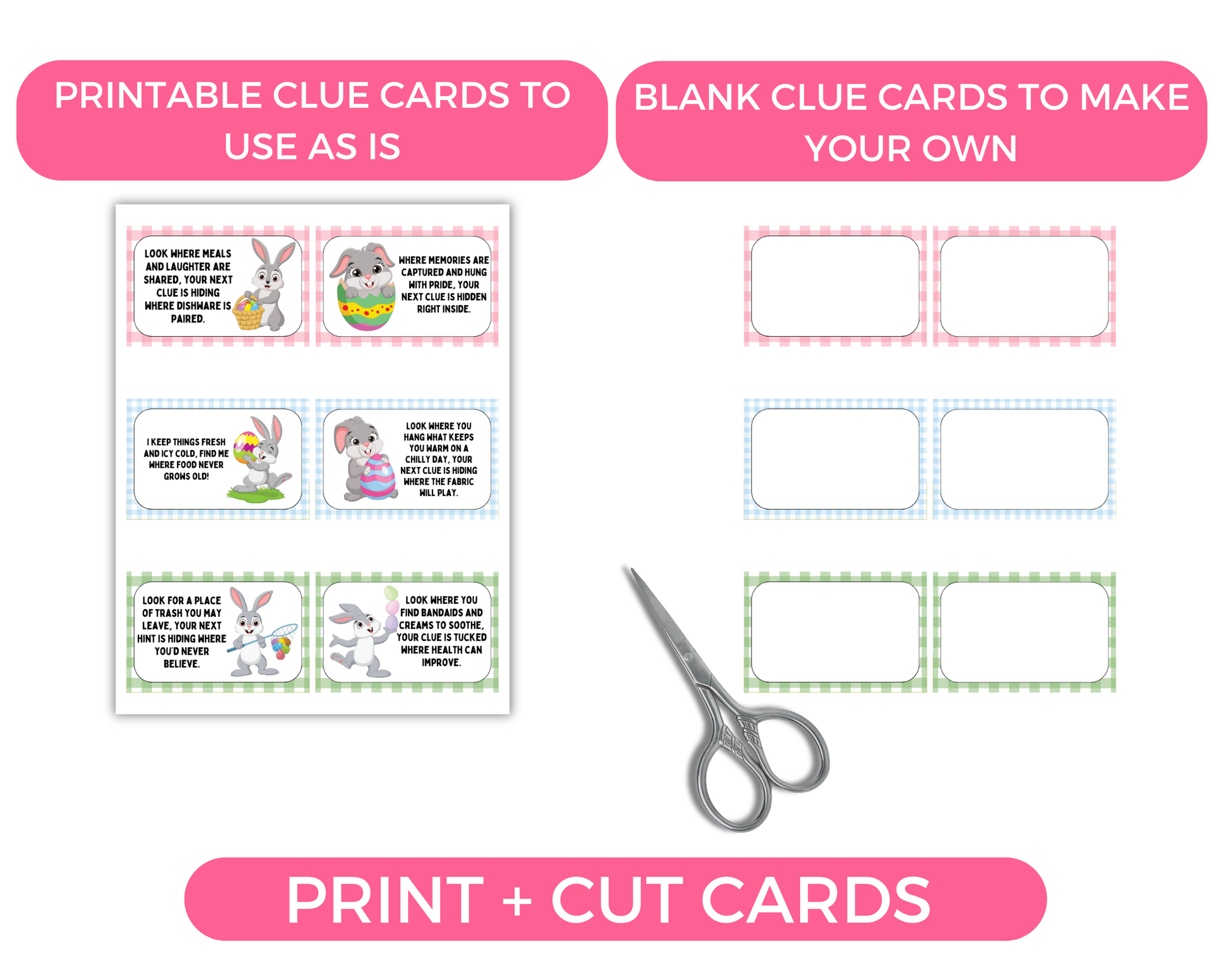 🔎 Cut out 24 Clue Cards. Write in your own blank ones if desired.