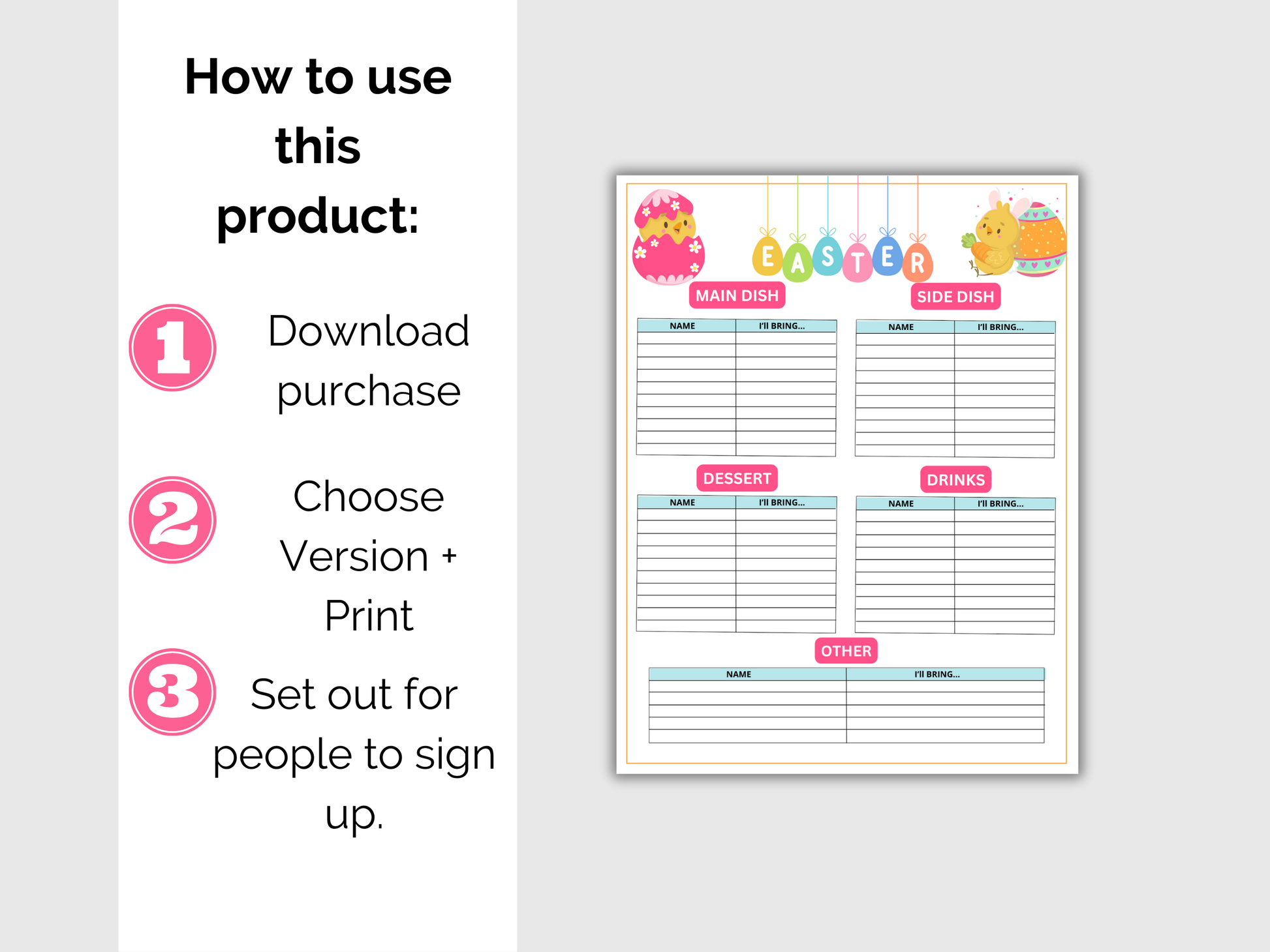 Easter Party Potluck Sign Up with 3 different designs - Print on 8.5 x 11 size paper