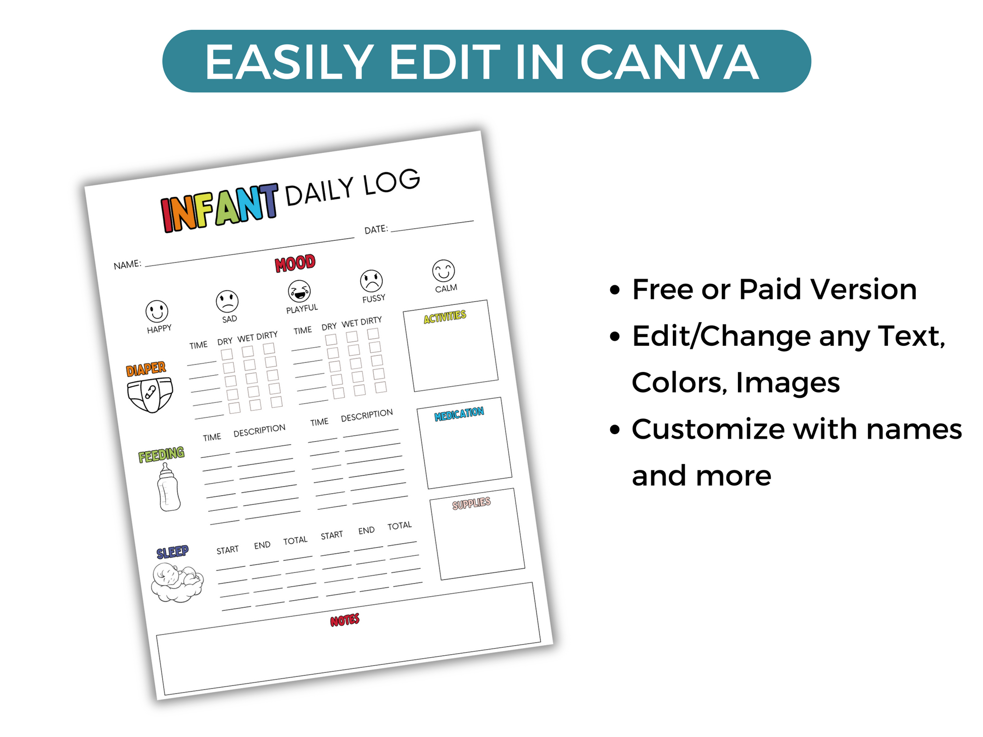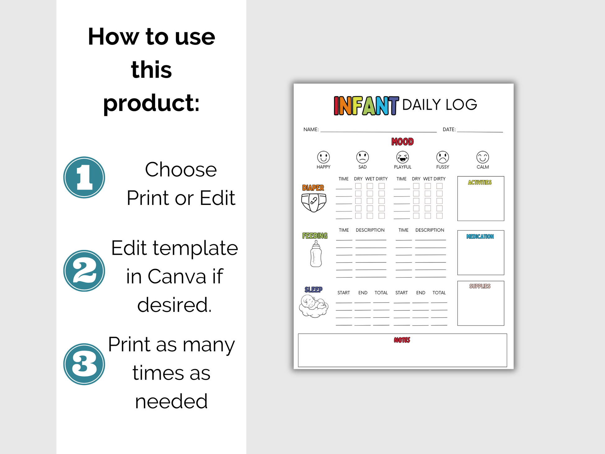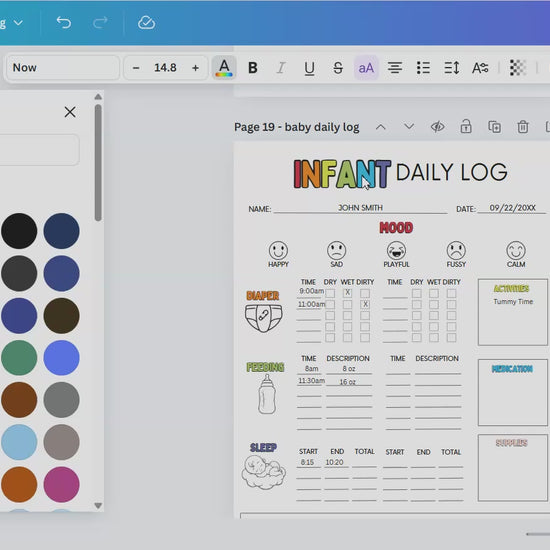 The Infant Daily Log can be printed, filled in by hand and used right away, or you can easily edit in Canva. Everything on it is editable - text, colors, graphics and more.