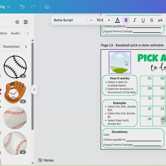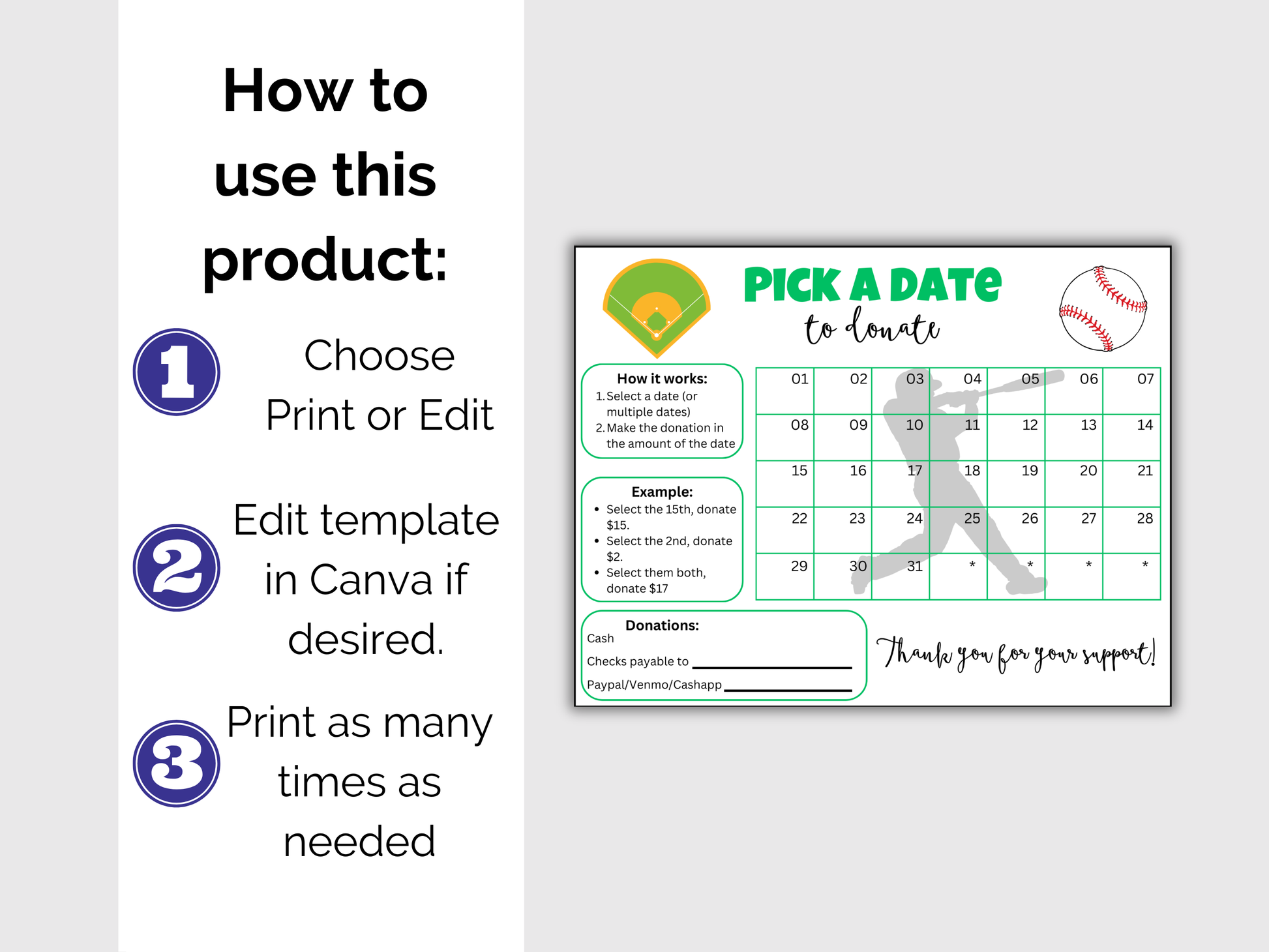 Baseball Pick A Date To Donate - Editable in Canva template link