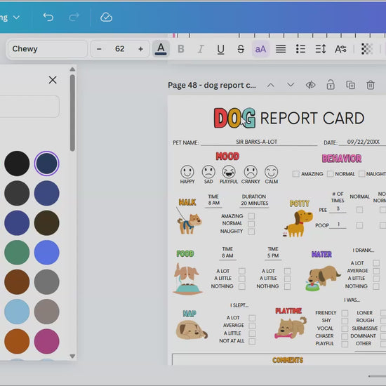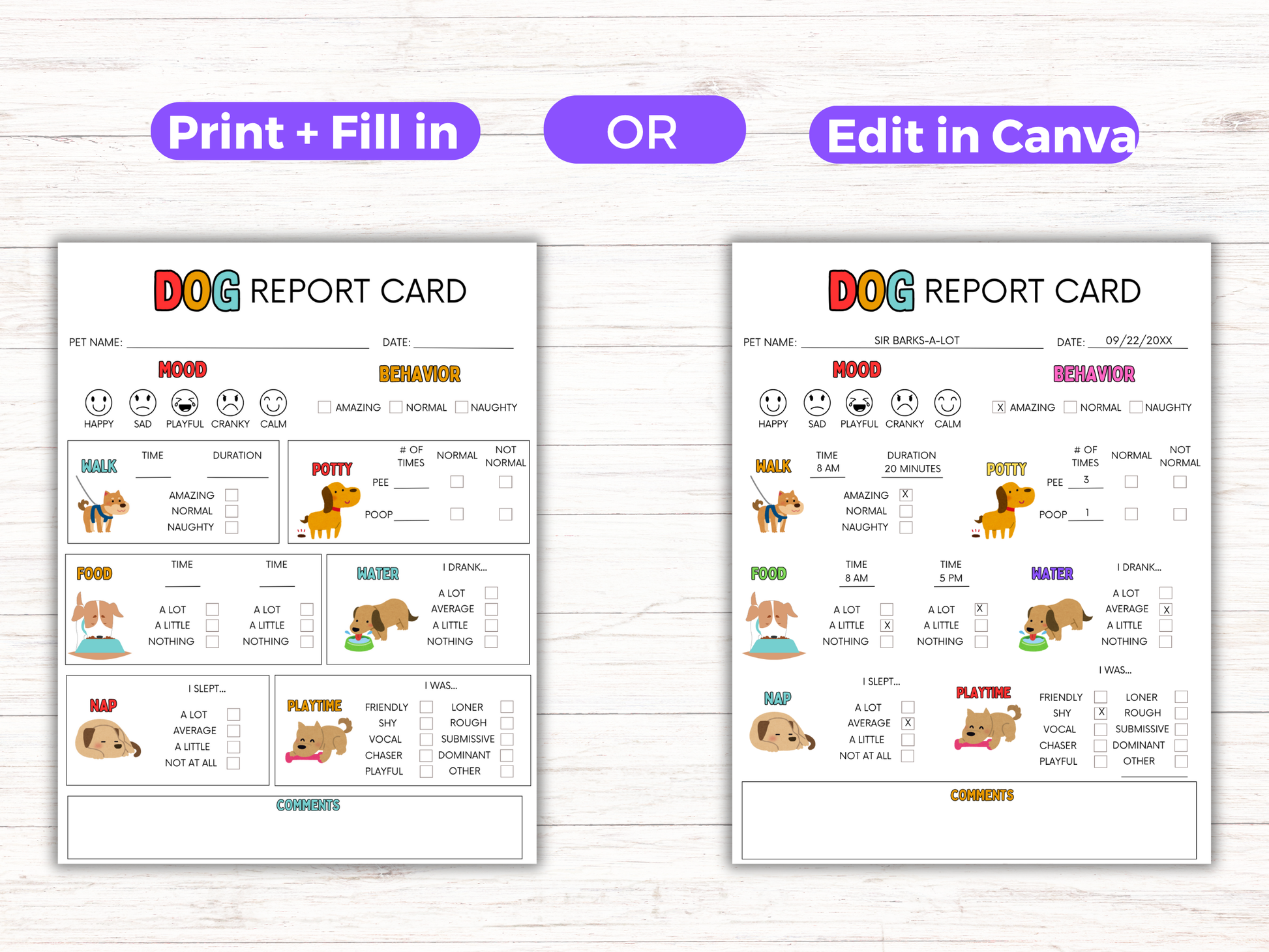 This easy editable Dog Report Card is great for pet sitters, dog walkers, dog boarding and more. Let pet owners know exactly how their dog is doing by tracking their food, water, walks, mood and more.
