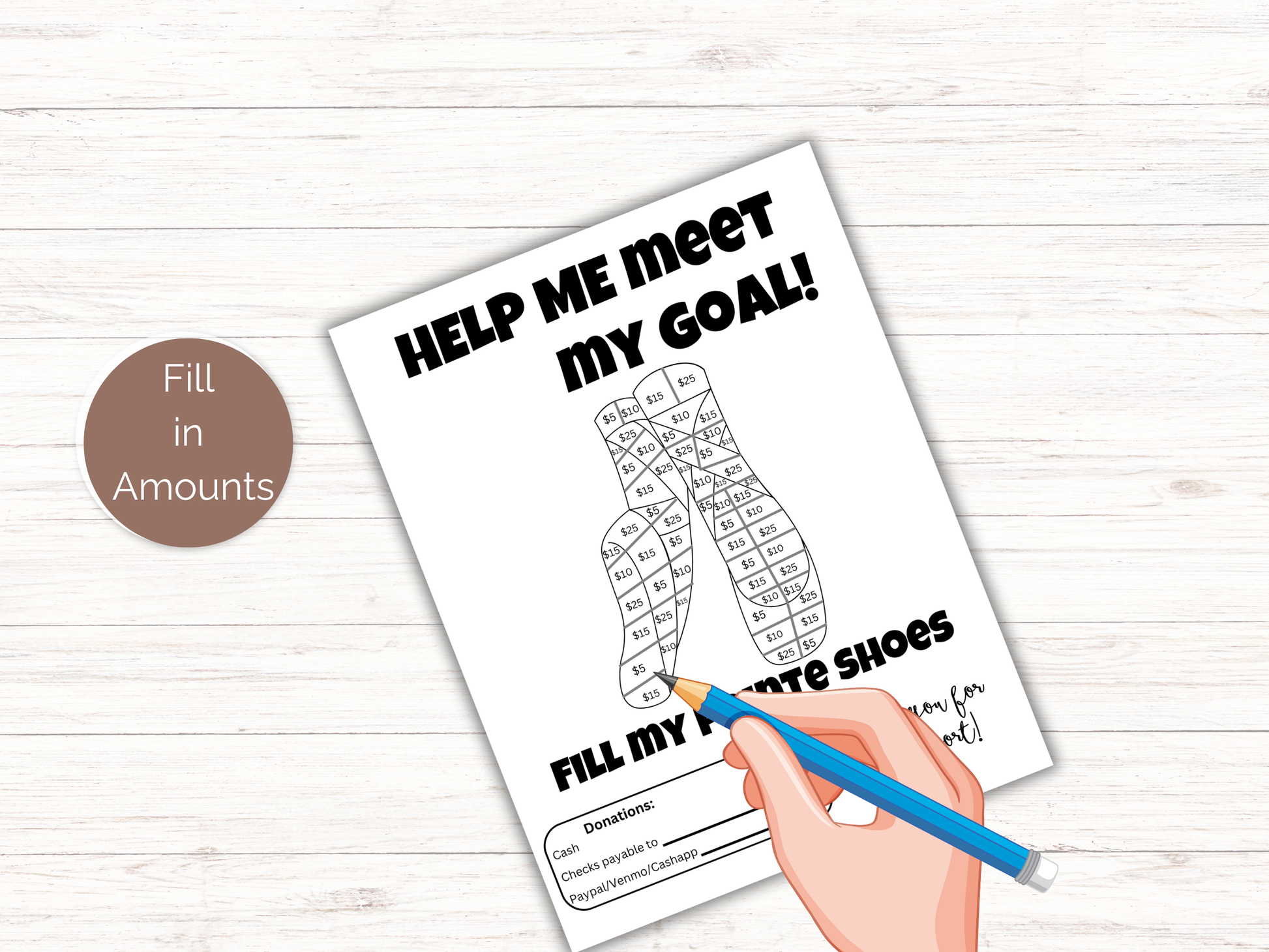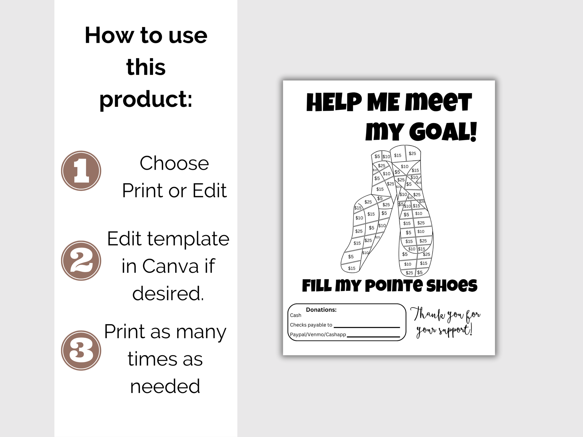 This easy editable Fill My Pointe Shoes fundraiser is the perfect way to raise money for your ballet season. It comes with a bonus Fundraising Tracker. Either edit the template in Canva - you can change font/text/images/team logo and more. Or, print as is.