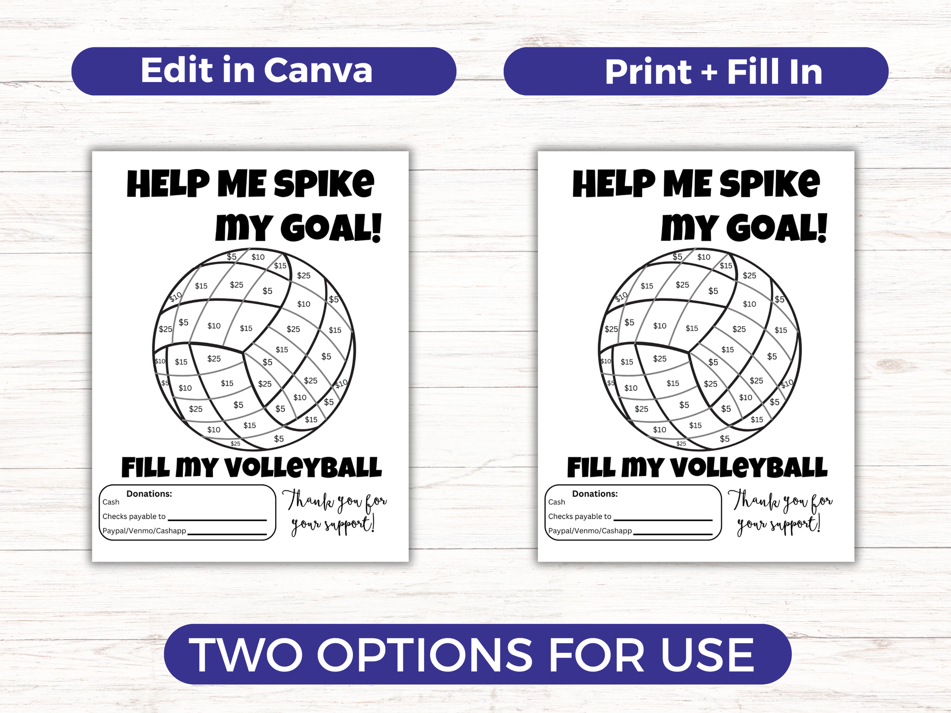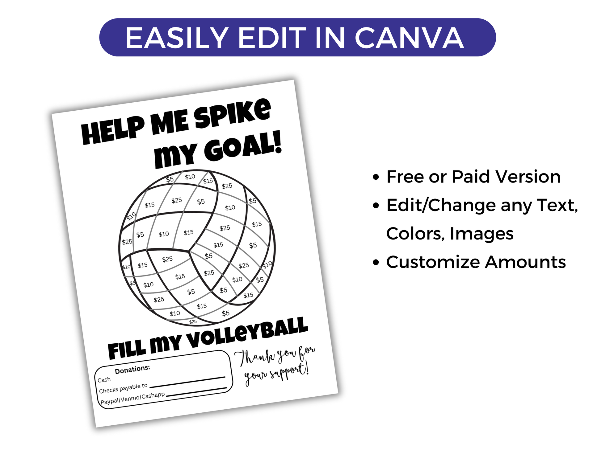 This easy editable Fill My Volleyball fundraiser is the perfect way to raise money for your volleyball season. It comes with a bonus Fundraising Tracker. Either edit the template in Canva - you can change font/text/images/team logo and more. Or, print as is.