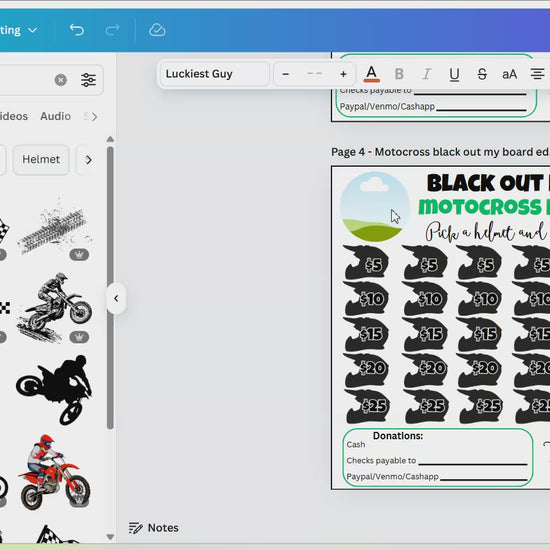 This easy editable Motocross Black Out My Board fundraiser is the perfect way to raise money for your motocross season. It comes with a bonus Fundraising Tracker. Either edit the template in Canva - you can change font/text/images/team logo and more. Or, print as is.