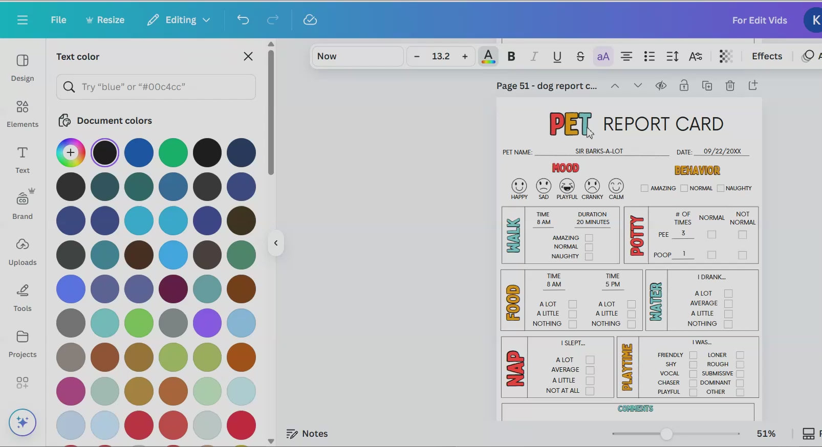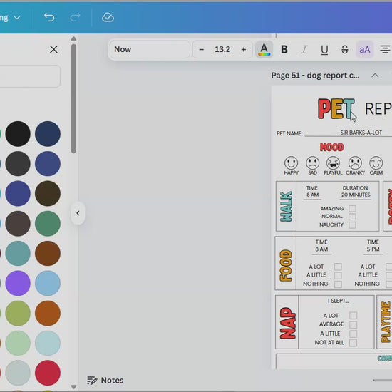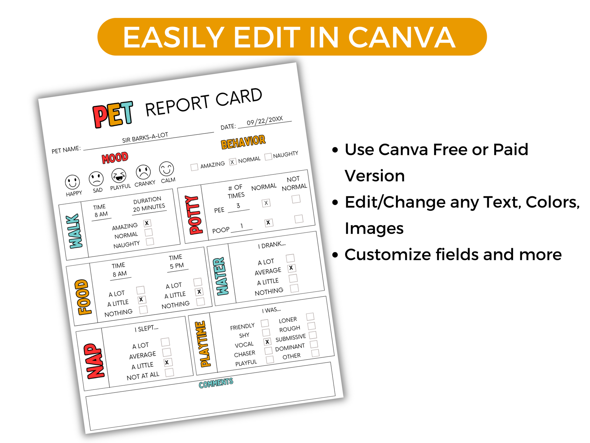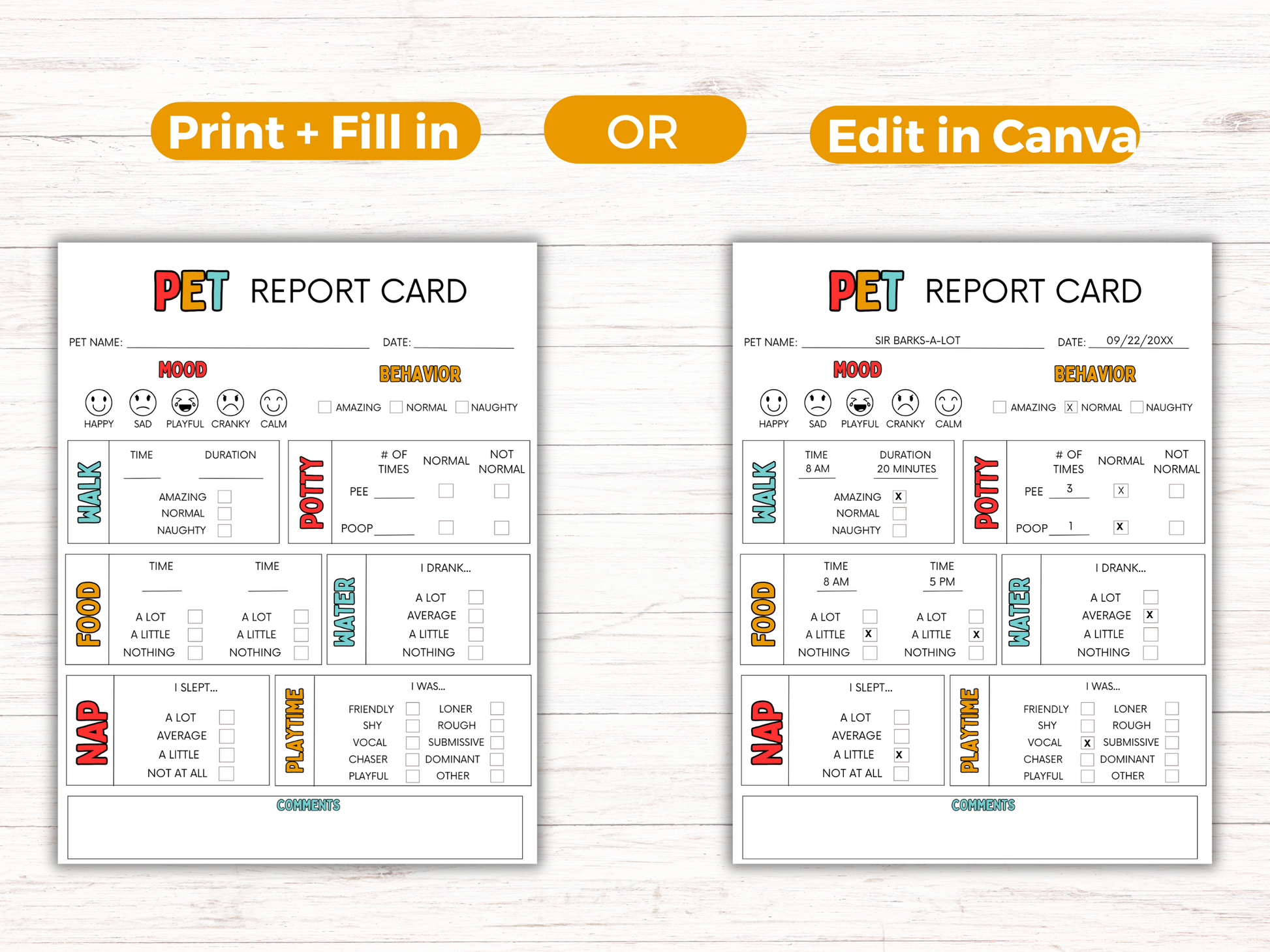 This easy editable Pet Report Card is great for Pet sitters, Pet boarding, Pet walking and more. Let pet owners know exactly how their pet is doing by tracking their food, water, mood and more.