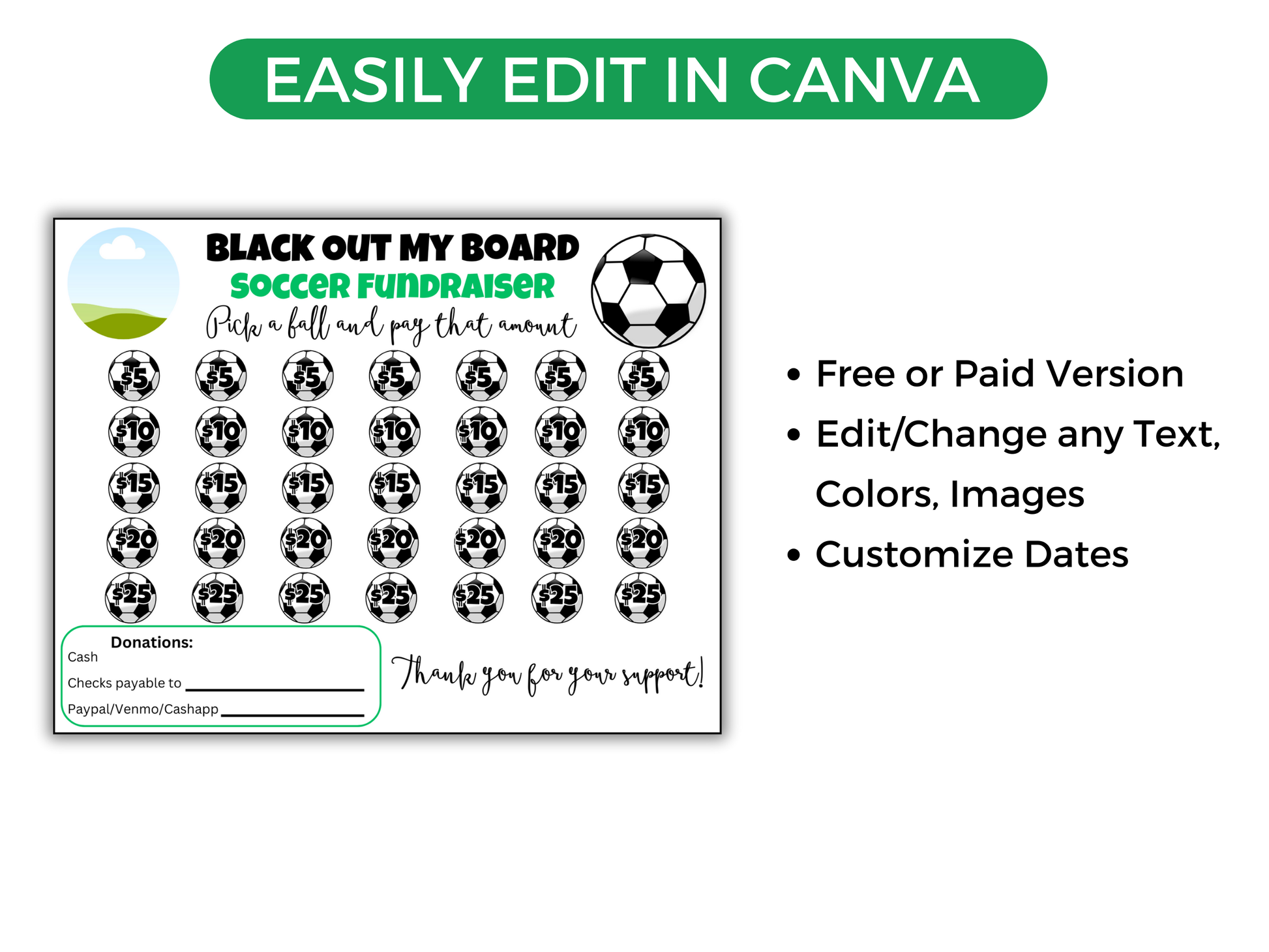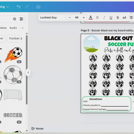 This easy editable Soccer Black Out My Board fundraiser is the perfect way to raise money for your soccer season. It comes with a bonus Fundraising Tracker. Either edit the template in Canva - you can change font/text/images/team logo and more. Or, print as is.