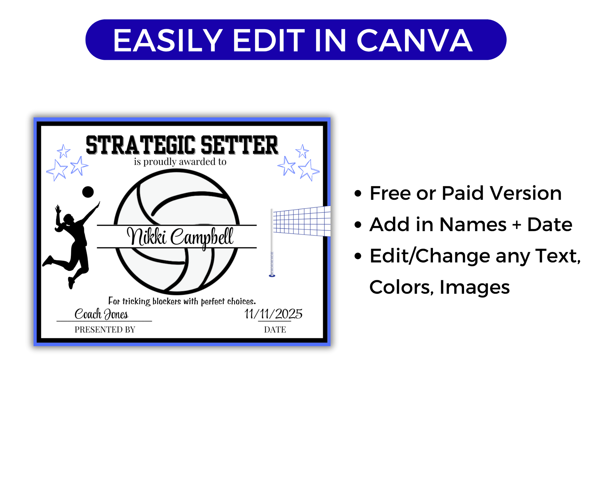 These Editable or Printable Volleyball Award Certificates are perfect for end of season volleyball team parties to recognize players. Either edit the template in Canva - you can add names, change font/text/images, change to your team colors Or, print and write in the names by hand.