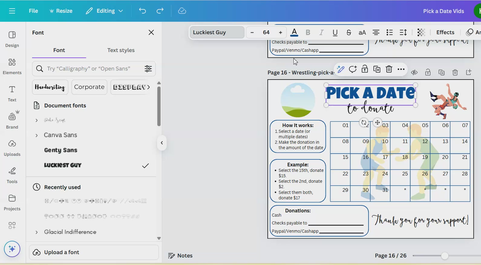 Wrestling Pick A Date To Donate - Editable in Canva template link