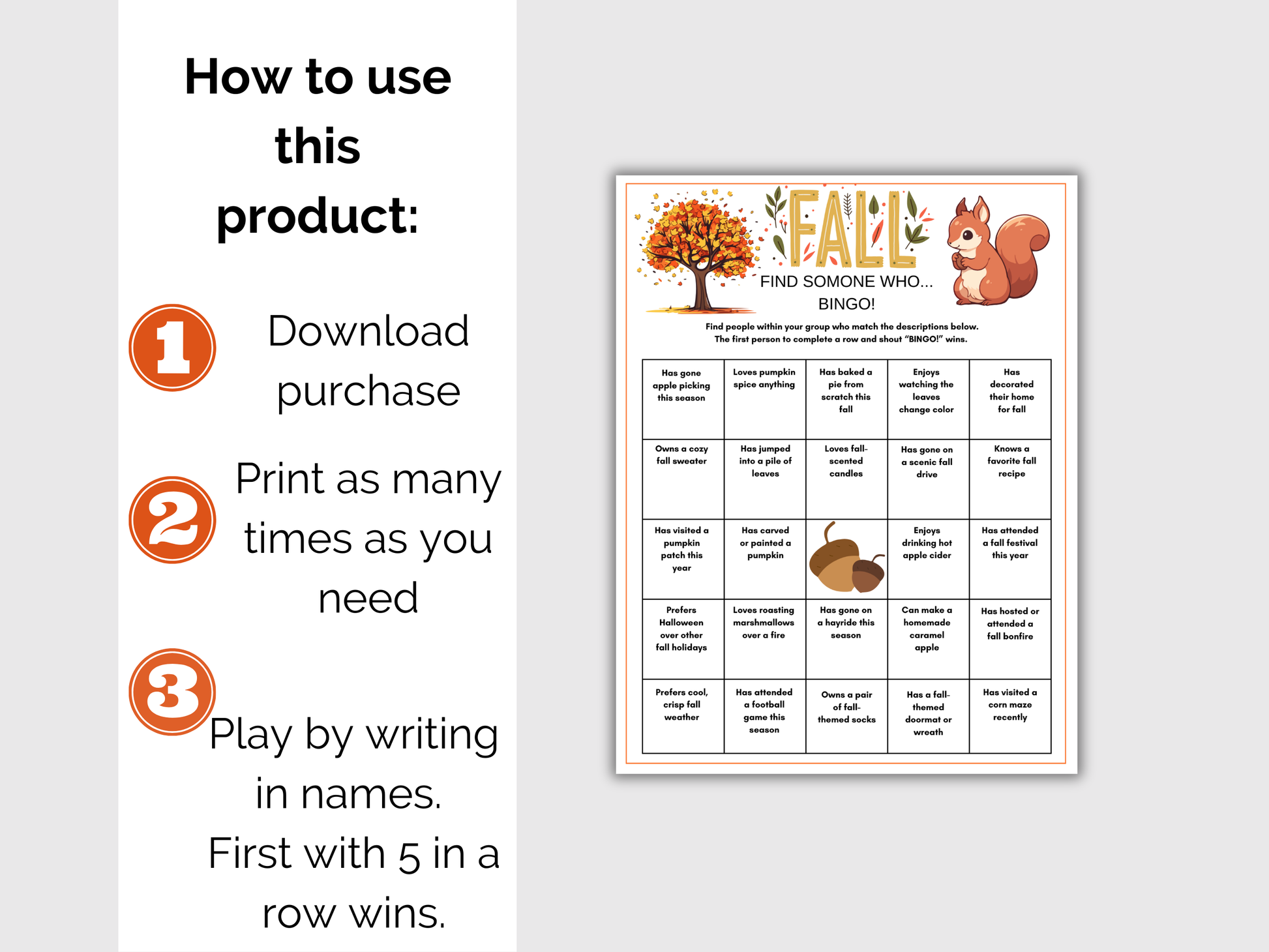 This fun Fall Find Someone Who Game is a great Fall themed activity for adults and kids to play as an icebreaker at birthdays, baby showers in the classroom and more. Simply print the game, mingle with guests, write names down, first to 5 in a row wins.