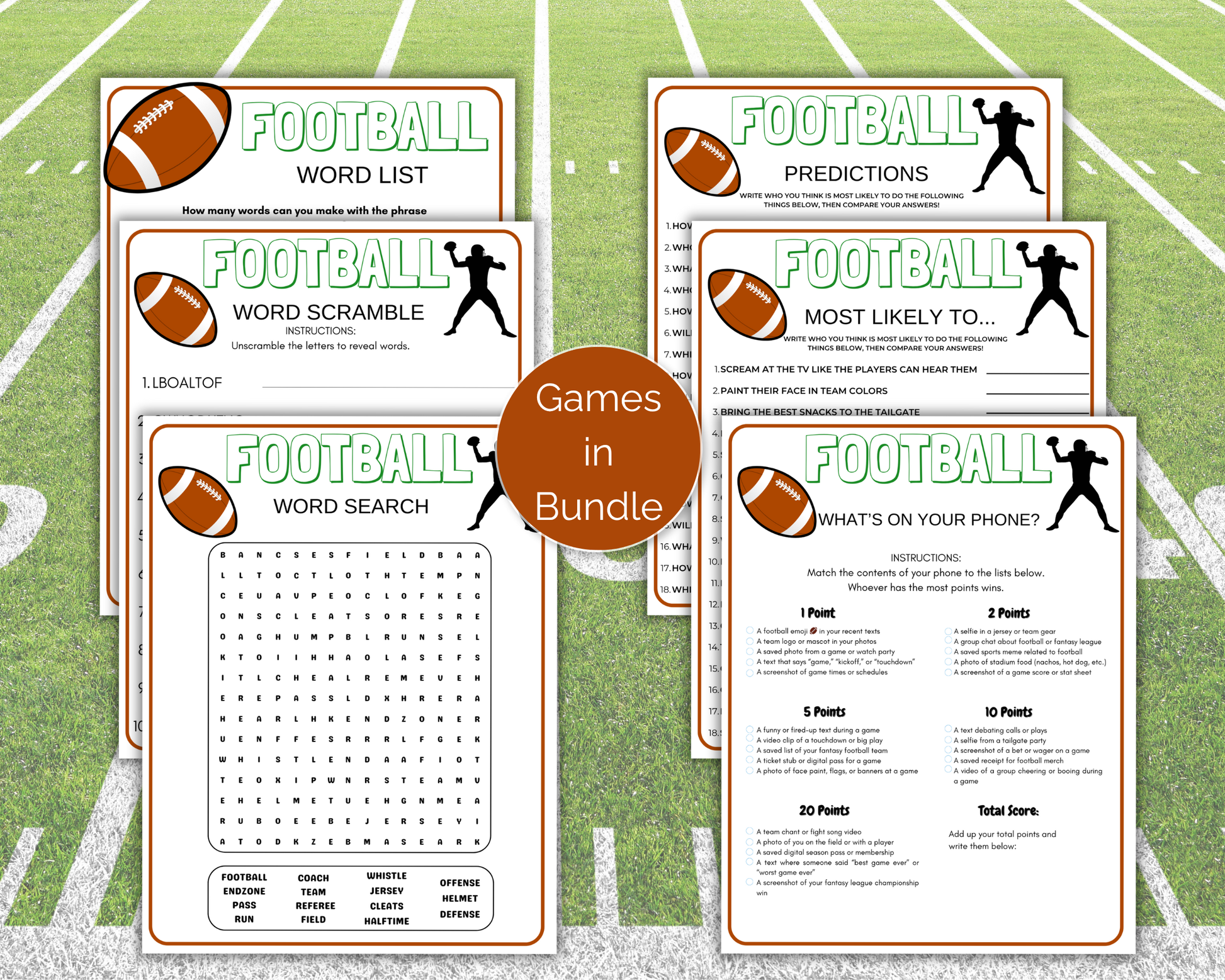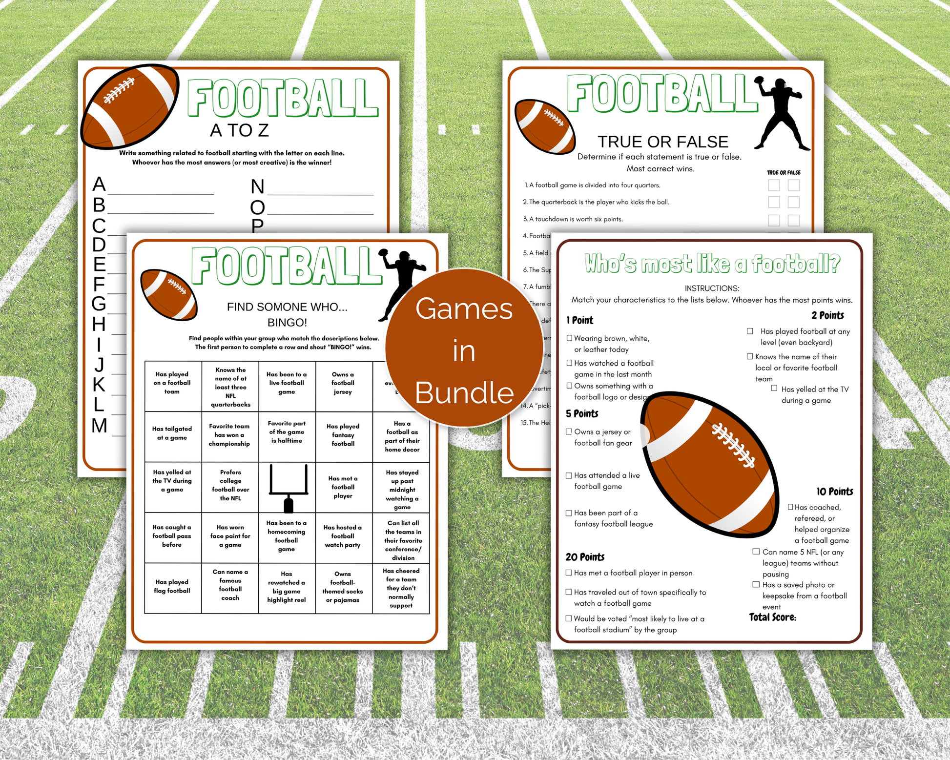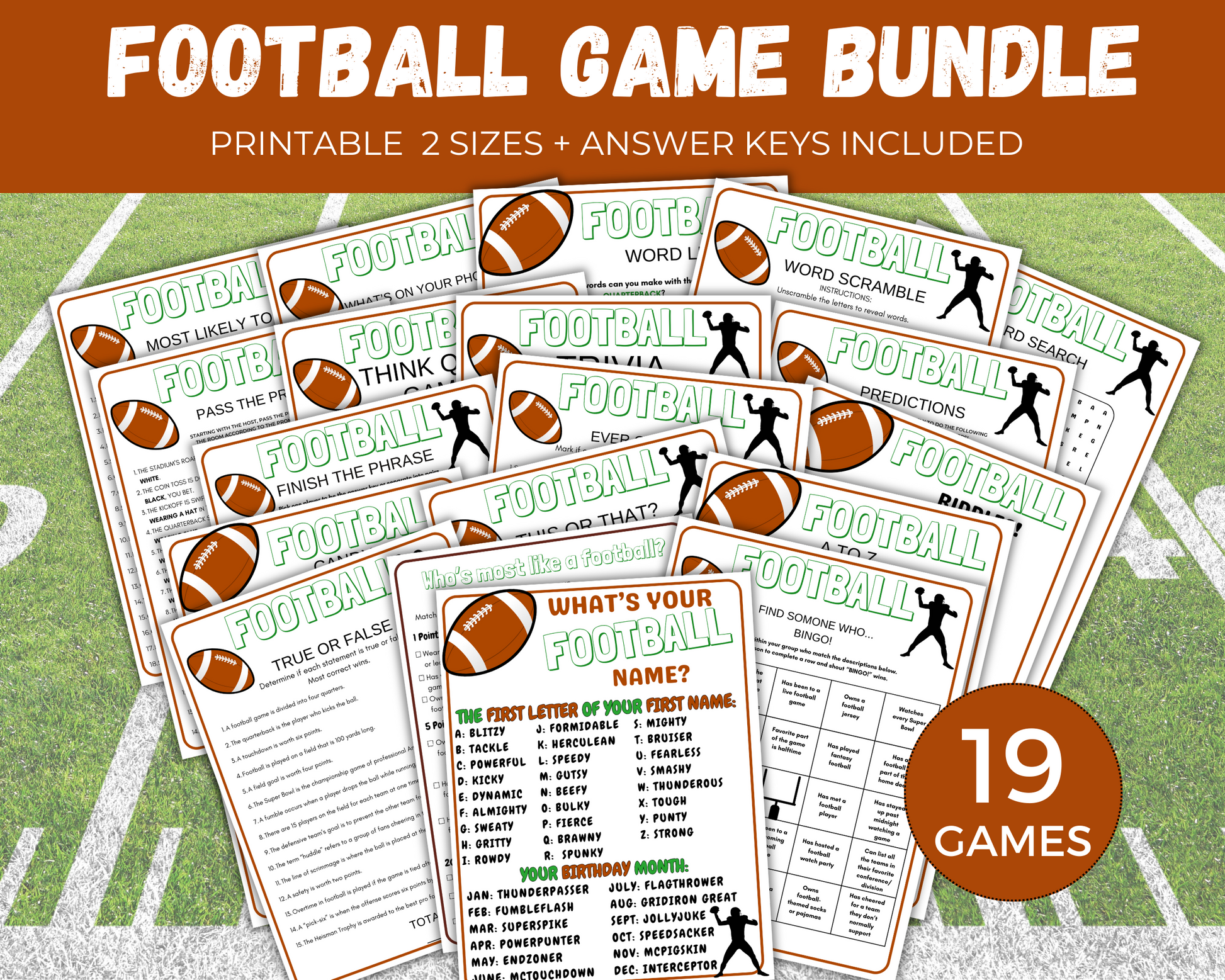 This fun Football Game bundle is a great football themed activity for adults, teens and kids to play at birthdays, tailgating parties, watch parties, team parties and more. It comes with 19 games. Simply print the games as many times as you like and start playing.