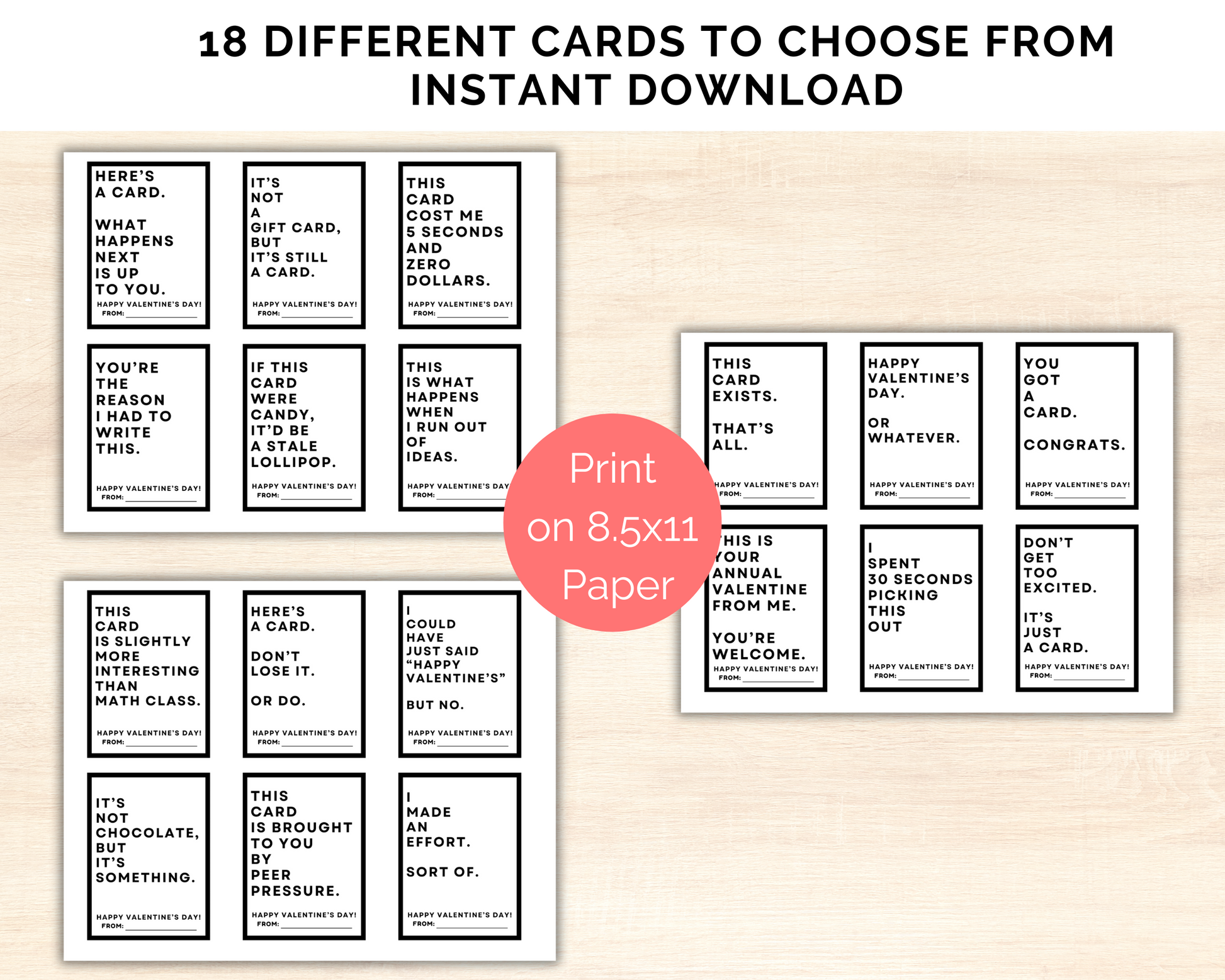 18 Funny Tween Valentine Cards - 6 per page, sized 2.75x3.75 inches each. Print on 8.5 x 11 paper.