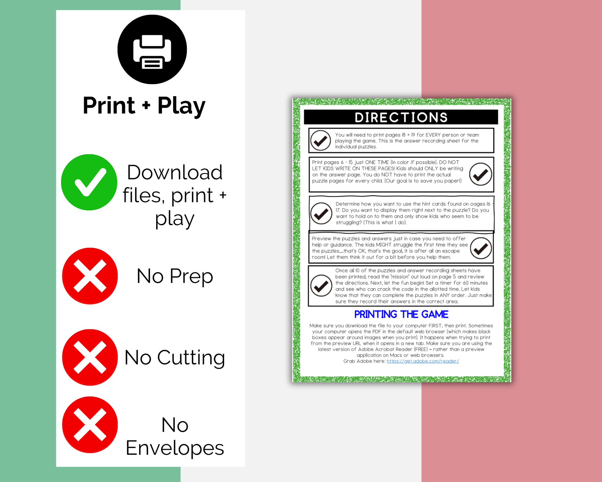There is NO prep, NO cutting, NO folding, NO envelopes etc needed for our escape room. Simply print the PDF file and start playing.