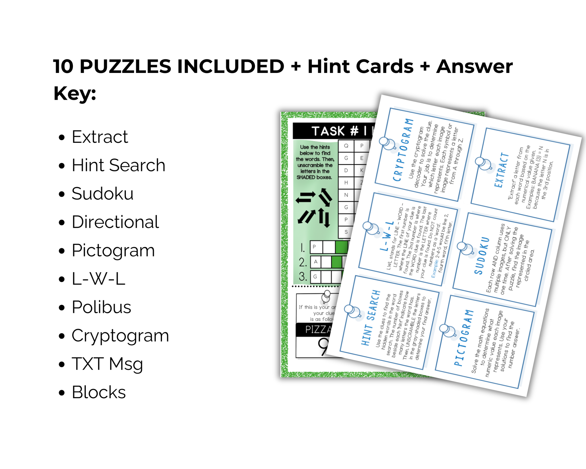 🔎Kids/teams will visit each of the 10 stations/puzzles and use their recording sheet to write the solution down. Hint cards are available for those who need them.
