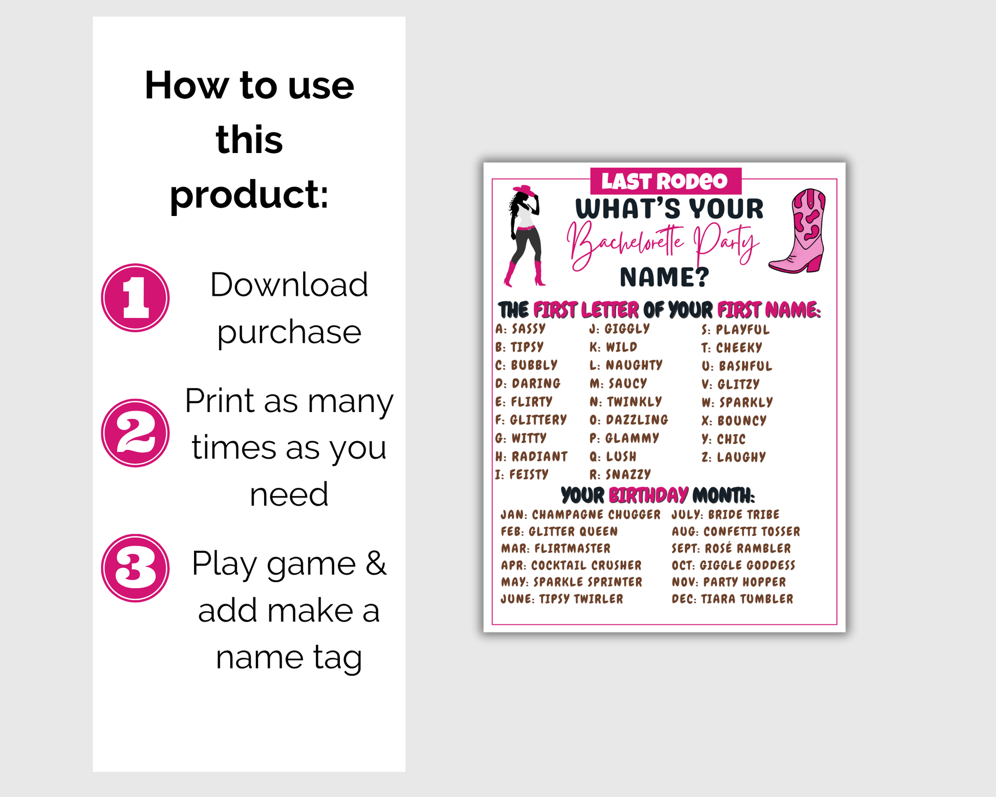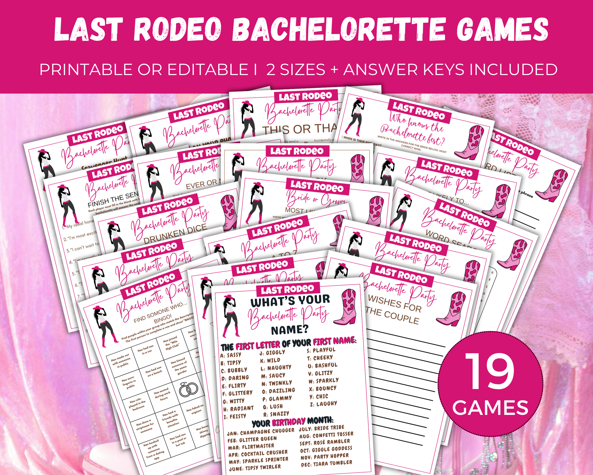 This fun Last Rodeo Bachelorette game bundle is a great bachelorette themed activity to play at bachelorette parties, hen parties and more. It comes with 19 games. You can print and play or edit the games. You can edit all text, colors, images and more in canva to customize these for your party.