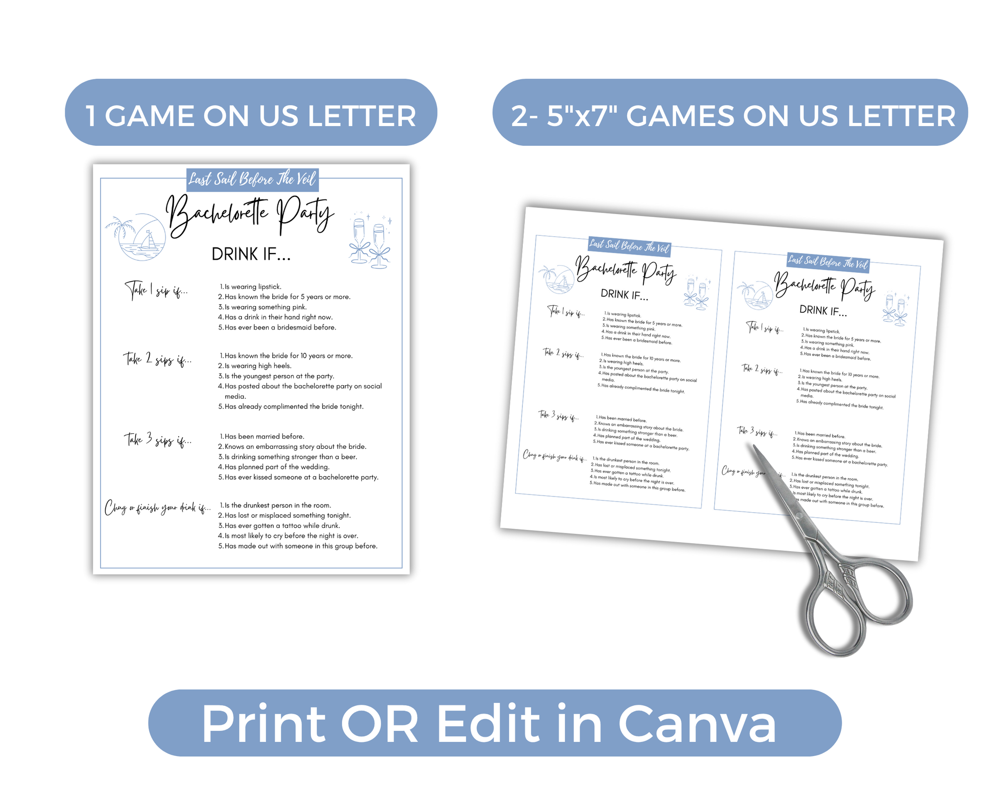 This fun Last Sail Before the Veil Bachelorette game bundle is a great bachelorette themed activity to play at bachelorette parties, hen parties and more. It comes with 19 games. You can print and play or edit the games. You can edit all text, colors, images and more in canva to customize these for your party.