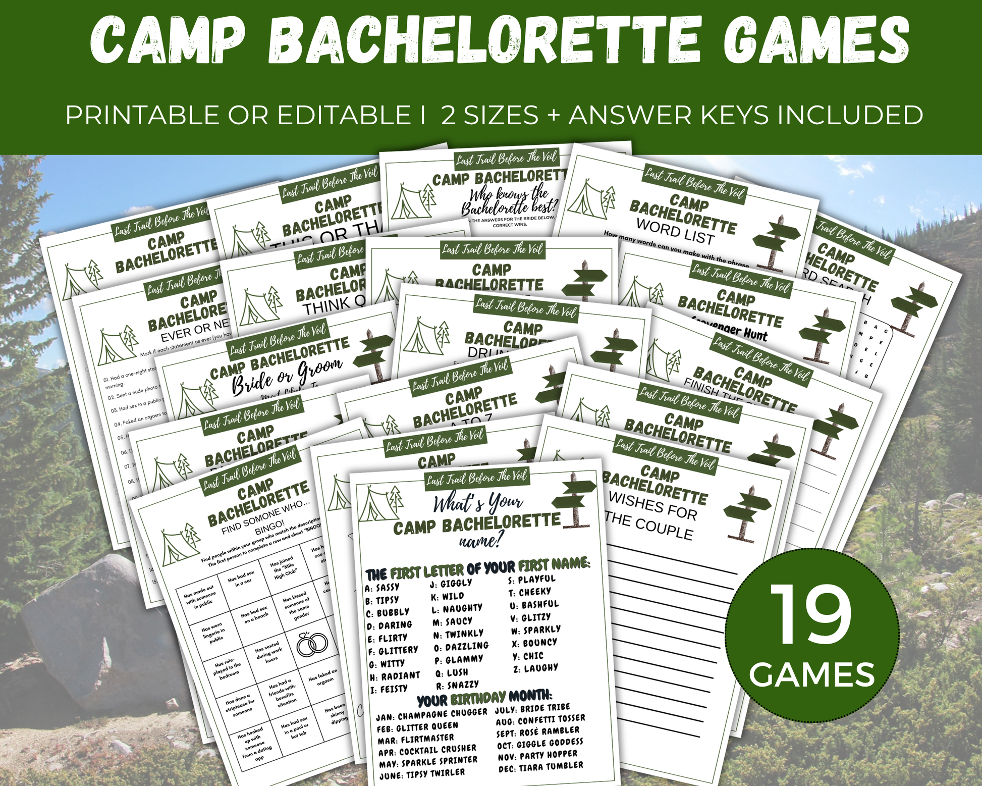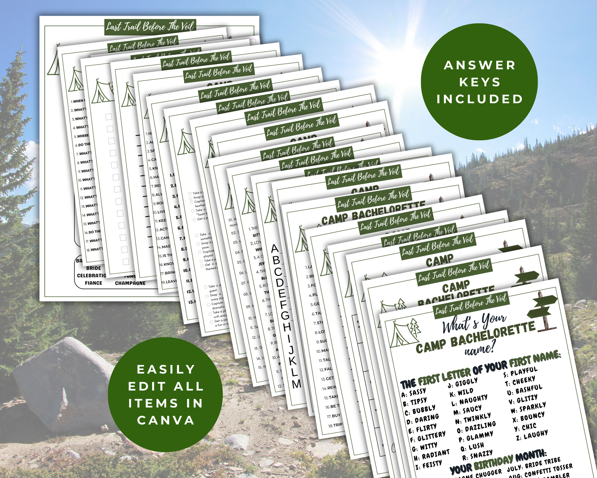➤ Camp Bachelorette Games - Editable in Canva template link