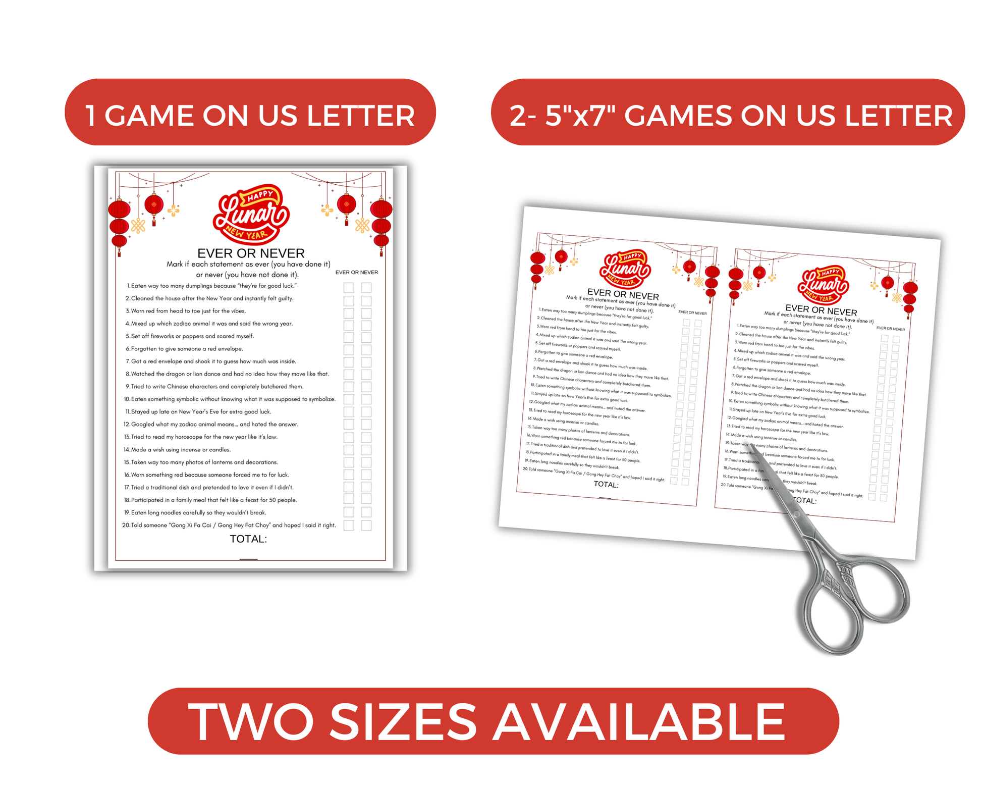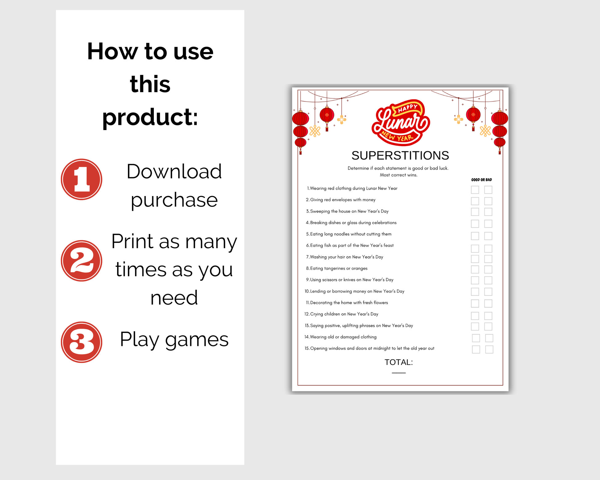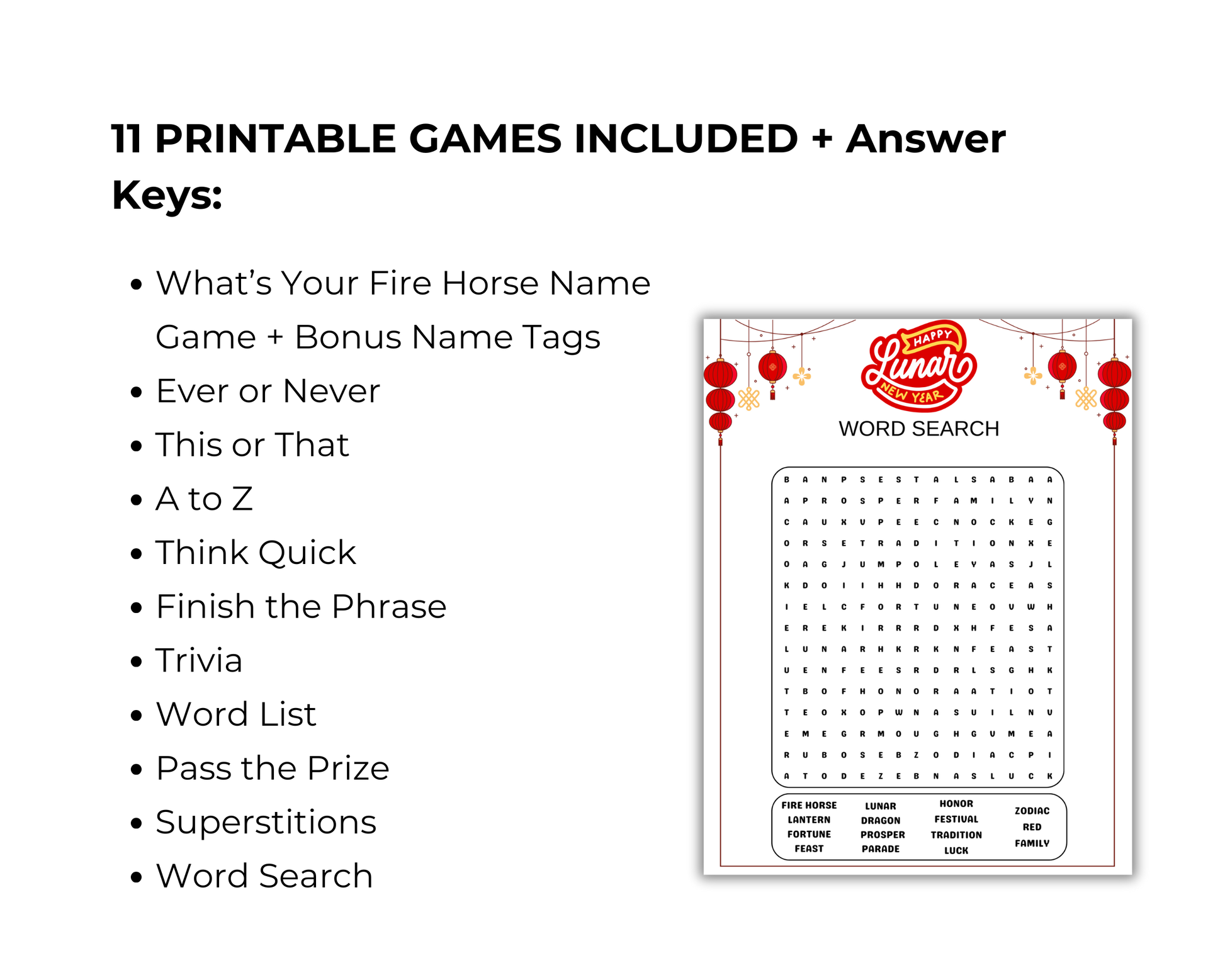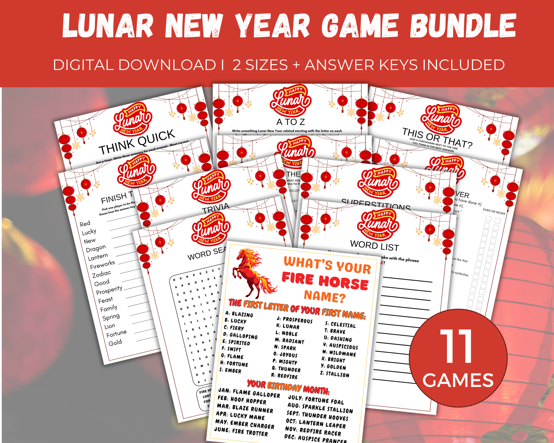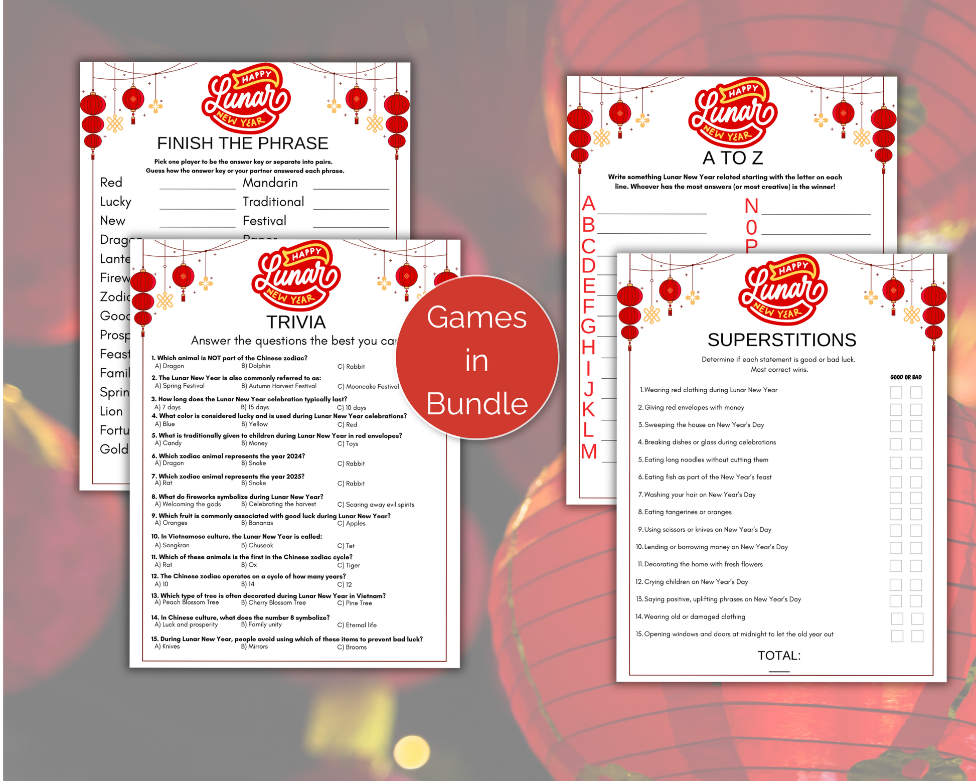 This fun 11 Lunar New Year Game Bundle is a great Lunar New Year themed activity for adults, families and kids to play at chinese new year celebrations, pub trivia night, in the classroom and more. It comes with 11 games. Simply print the games as many times as you like and start playing.