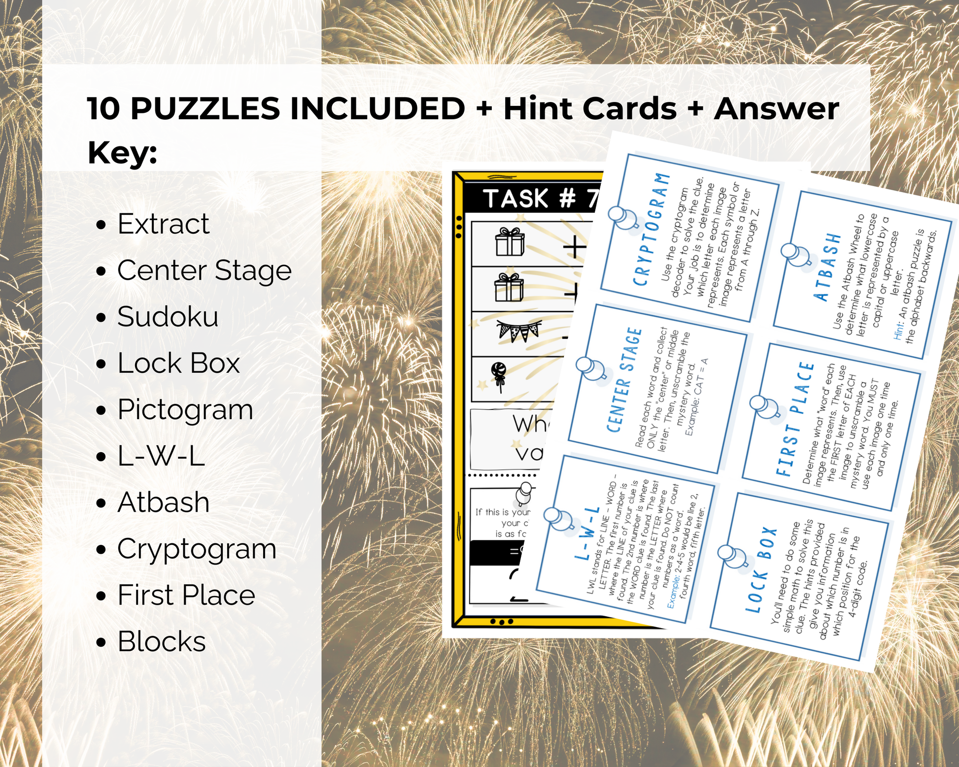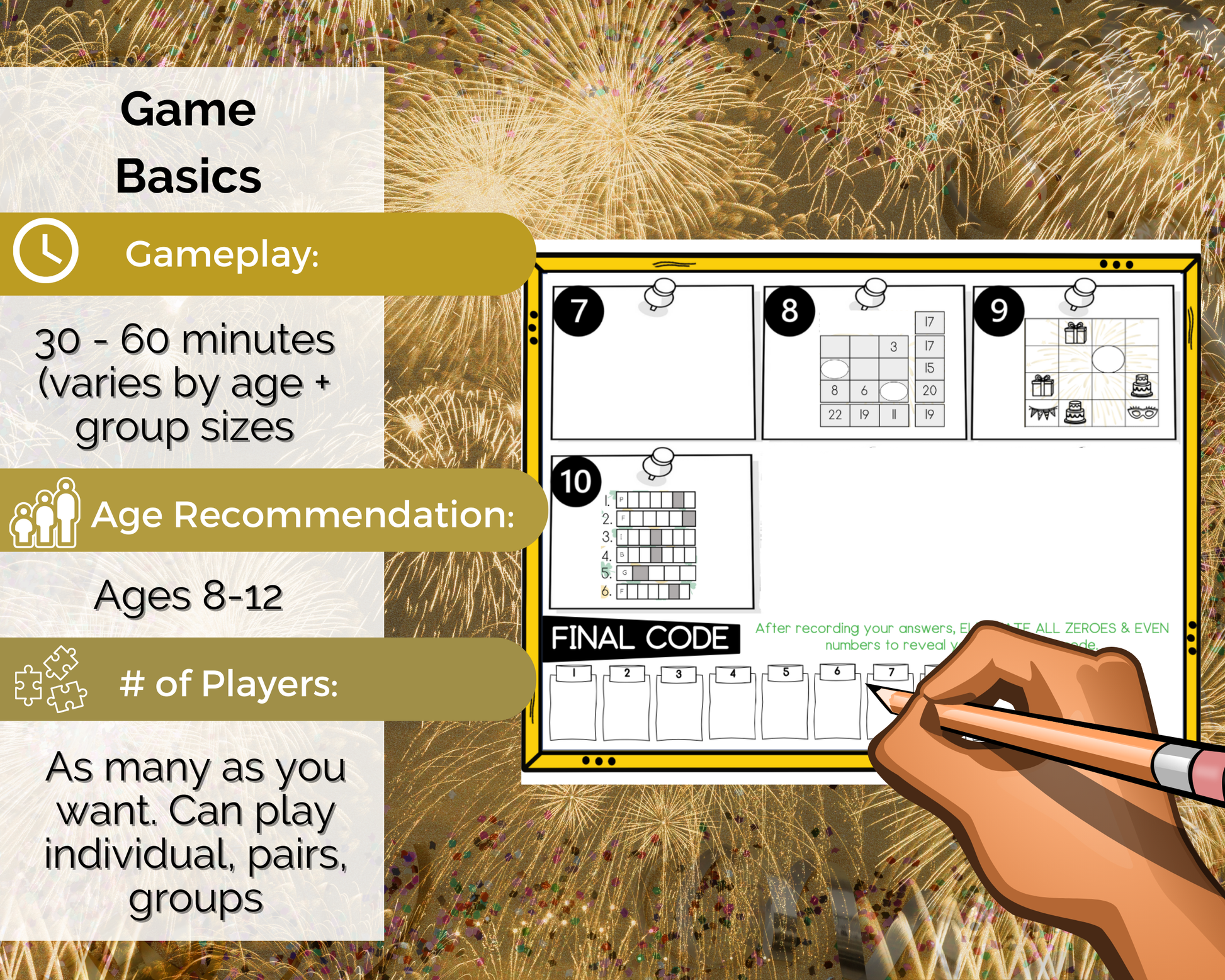This fun Broken Countdown New Years Eve Escape Room is a great New Years Eve activity for kids to play. It comes with 10 puzzle challenges that reveal a secret code to win/escape. This fun escape room game is great for kids aged 8-12 to play at new years eve parties, sleepovers, celebrations, and more.