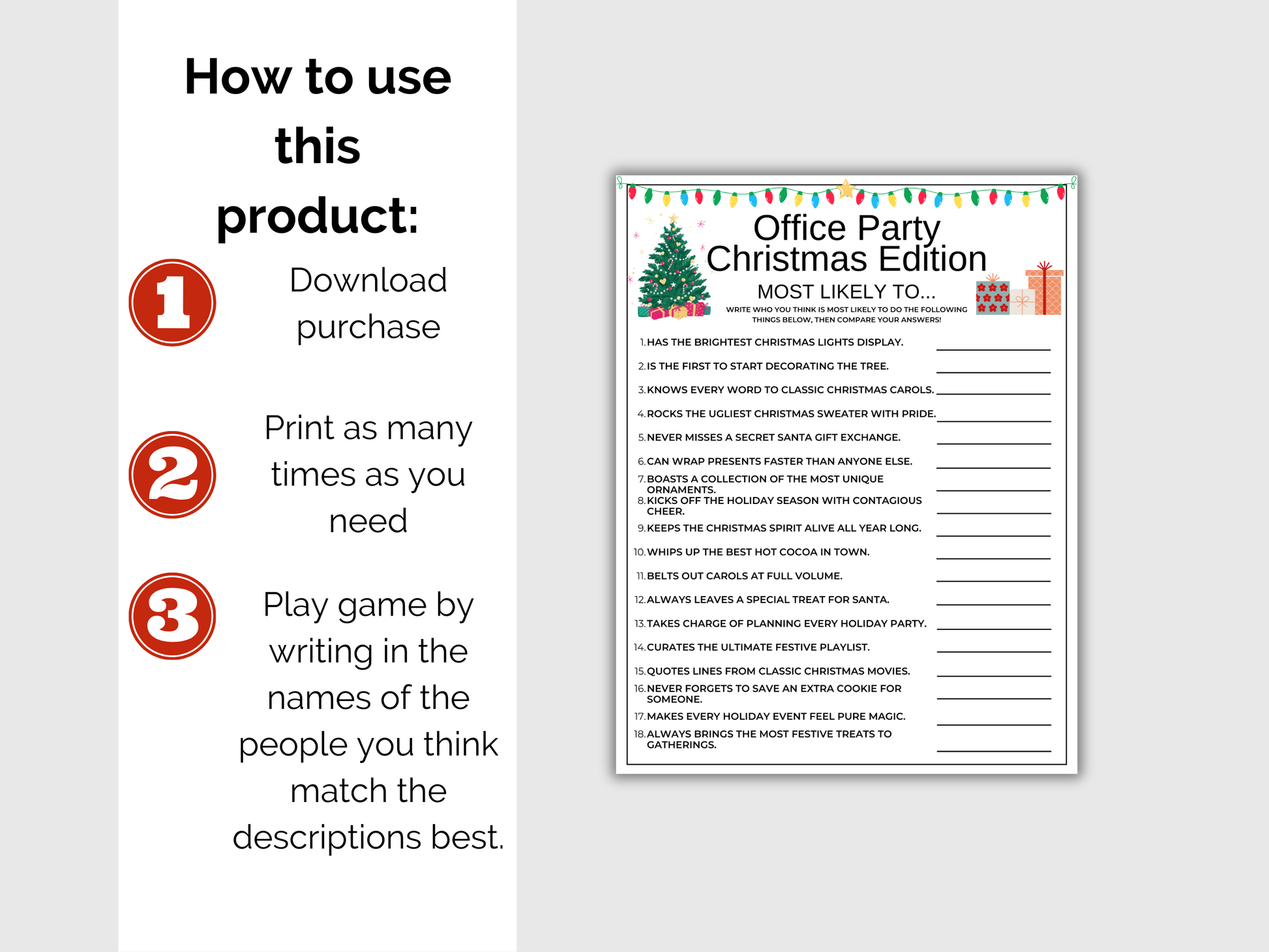 This fun Office Christmas Most Likely To is a great Christmas themed activity to play at christmas parties, holiday office parties and more. Simply print the game, write in who you think fits the descriptions and compare answers.