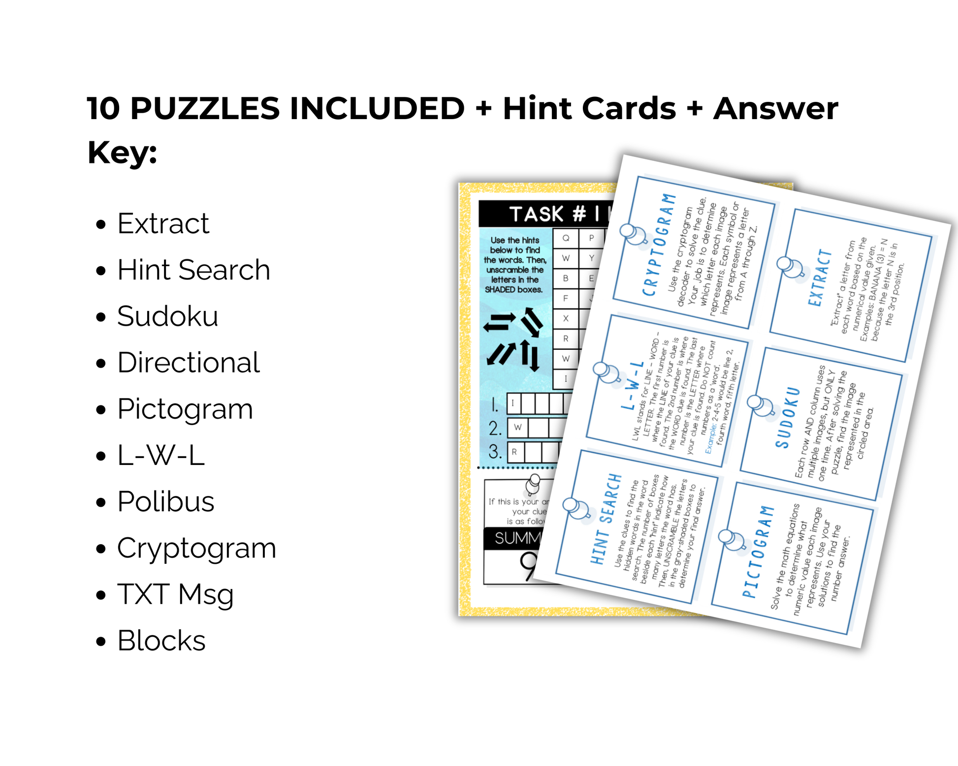 🔎Kids/teams will visit each of the 10 stations/puzzles and use their recording sheet to write the solution down. Hint cards are available for those who need them.