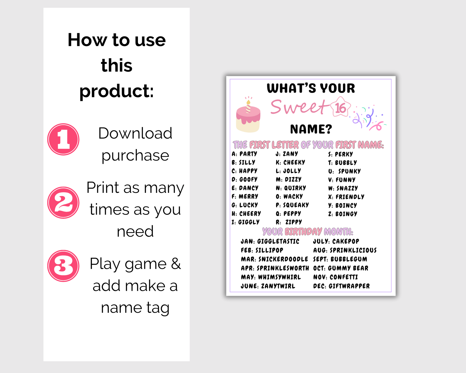 This fun Sweet 16 Game bundle is a great birthday themed activity to play at birthday parties and more. It comes with 16 games. Simply print the games as many times as you like and start playing.