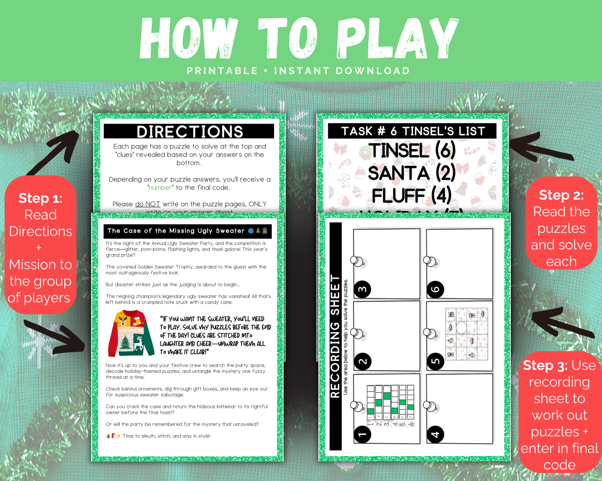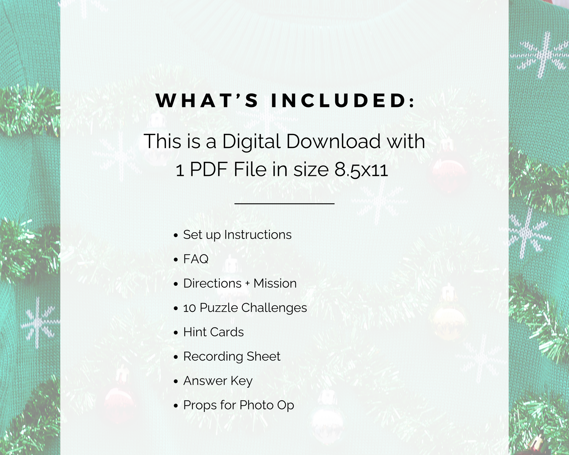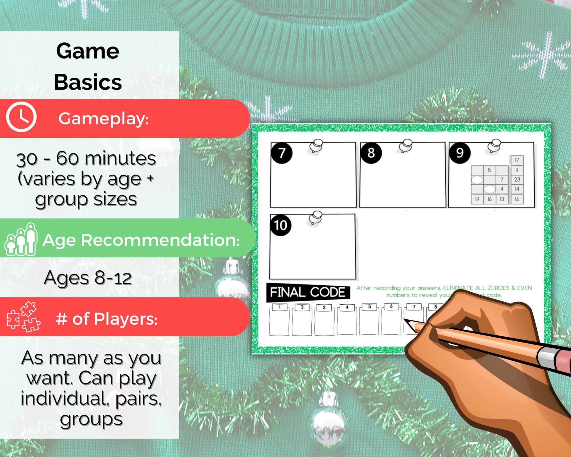 This fun Ugly Sweater Escape Room is a great christmas themed activity for kids to play. It comes with 10 puzzle challenges that reveal a secret code to win/escape. This fun escape room game is great for kids aged 8-12 to play at christmas, sleepovers, celebrations, and more.