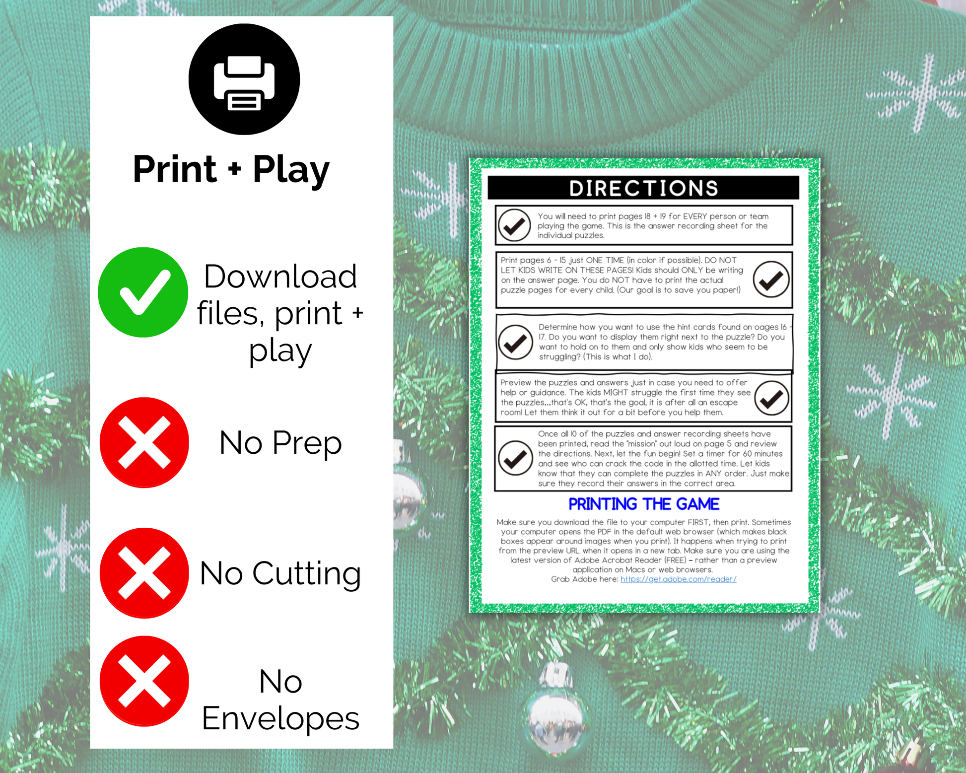 There is NO prep, NO cutting, NO folding, NO envelopes etc needed for our escape room. Simply print the PDF file and start playing.