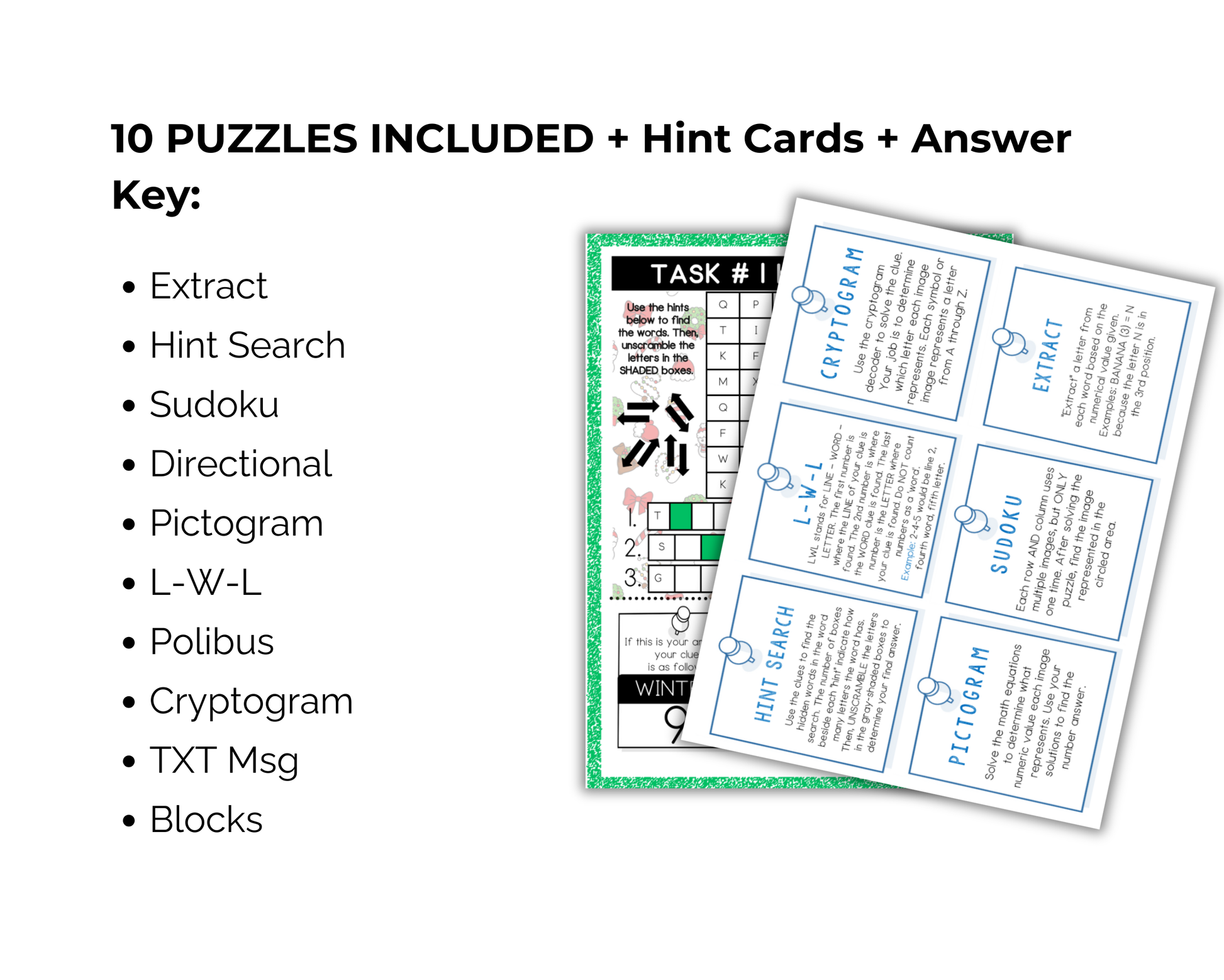🔎Kids/teams will visit each of the 10 stations/puzzles and use their recording sheet to write the solution down. Hint cards are available for those who need them.