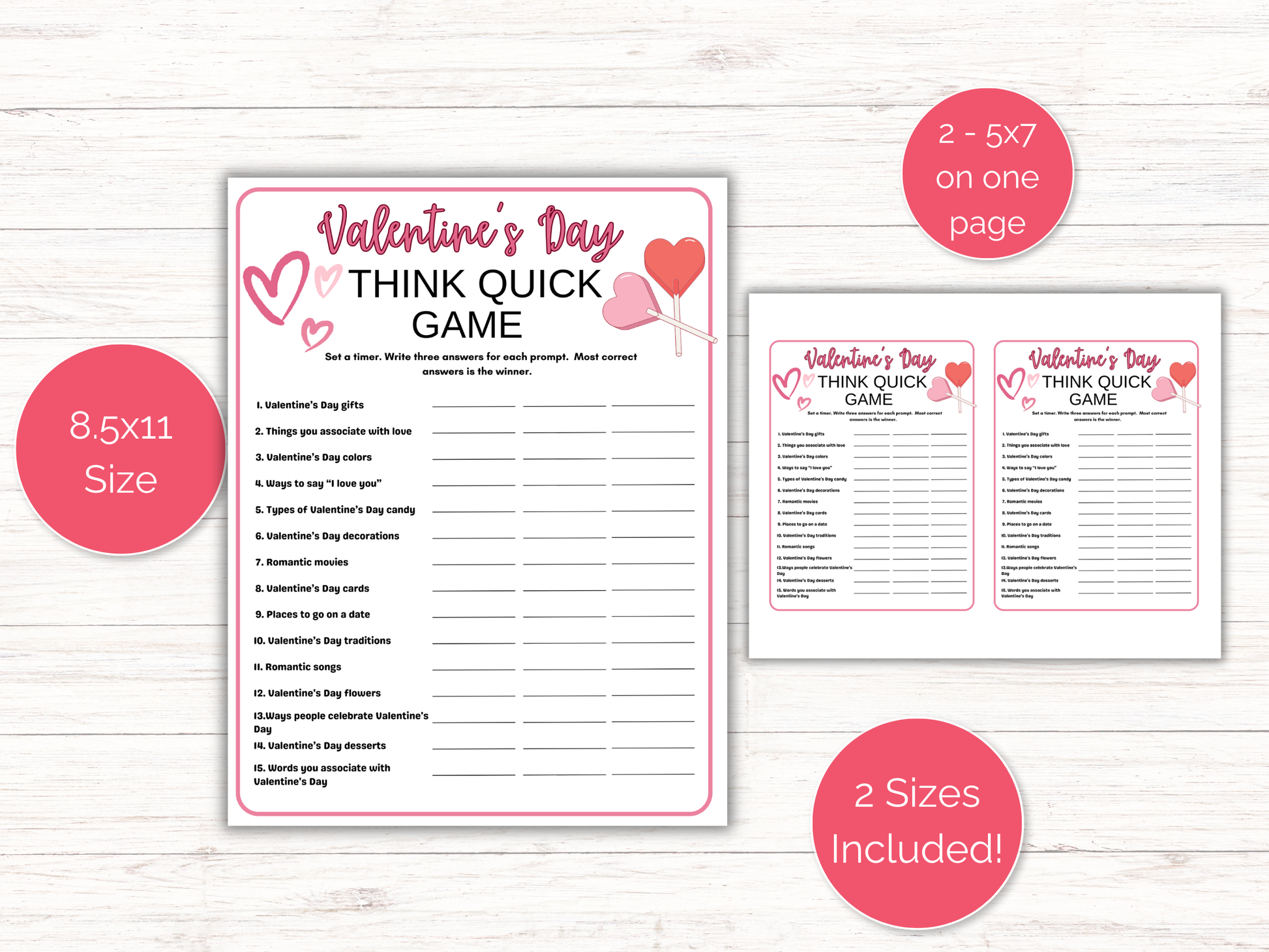 Valentines Day Think Quick - Print 2 games on one 8.5 x 11 sheet of paper